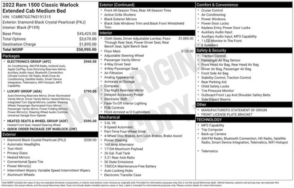 Get ready to hit the road in this Ram 1500 Classic, a standout choice for drivers looking for reliability, performance, and style! This impressive vehicle is packed with premium features designed to make every drive more enjoyable. Plus, youâll enjoy a $1,000 finance savings, already included in the sale price, when you finance through one of our trusted lending partners. Whether youâre searching for used cars in Salt Lake City, a dependable SUV, or a powerful truck, this Ram 1500 Classic delivers everything you need and more. Visit Salt Lake Valley Chrysler Dodge Jeep Ram today to test drive or explore our entire selection of quality pre-owned vehicles. Donât wait - shop online at www.slvcdjr.com or call 801-484-8755 to learn more! This amazing vehicle comes loaded with options like Electronics Group (4G LTE Wi-Fi Hot Spot, 8.4" Touchscreen Display, Air Conditioning ATC w/Dual Zone Control, Apple CarPlay, Audio Input Jack for Mobile Devices, Auto-Dimming Rear-View Mirror, Cluster 7.0" TFT Color Display, Google Android Auto, GPS Antenna Input, Integrated Center Stack Radio, Integrated Voice Command w/Bluetooth, Media Hub (2 USB, AUX), Radio: Uconnect 5 w/8.4" Display, Remote USB Port, and USB Host Flip), Heated Seats & Wheel Group (Heated Front Seats and Heated Steering Wheel), Luxury Group (Auto-Dimming Exterior Mirrors, Black Exterior Mirrors, Exterior Mirrors Courtesy Lamps, Exterior Mirrors w/Heating Element, Exterior Mirrors w/Supplemental Signals, Glove Box Lamp, Leather Wrapped Steering Wheel, LED Bed Lighting, Overhead Console w/Garage Door Opener, Power Heated Fold-Away Mirrors, Power-Folding Mirrors, Rear Dome w/On/Off Switch Lamp, Steering Wheel Mounted Audio Controls, Sun Visors w/Illuminated Vanity Mirrors, and Universal Garage Door Opener), Quick Order Package 29F Warlock (4x4 Flat Black Badge, B-Pillar Black Out, Bi-Function Halogen Projector Headlamps, Black Exterior Truck Badging, Black Grille w/RAM Lettering, Black Headlamp Filler Panel, Black Powder Coated Front Bumper, Black Powder Coated Rear Bumper, Black RAM Head Tailgate Badge, Black Wheel Flares, Front Wheel Well Liners, ParkSense Rear Park Assist System, Raised Ride Height, Rear Extra HD Shock Absorbers, Semi-Gloss Black Hub, Sport Tail Lamps, Warlock, Warlock Interior Accents, and Wheels: 20" x 9" Semi-Gloss Black Aluminum), SiriusXM Guardian - Included Trial (B) (1 Year Trial (Registration Required), For Details Visit DriveUconnect.com, and Global Telematics Box Module (TBM)), 3.21 Rear Axle Ratio, 4-Wheel Disc Brakes, 40/20/40 Split Bench Seat, 6 Speakers, ABS brakes, Active Grille Shutters, Air Conditioning, Alloy wheels, AM/FM radio: SiriusXM, Brake assist, Bumpers: chrome, Center Hub, Charge Only Remote USB Port, Cloth 40/20/40 Bench Seat, Compass, Connected Services Delete Credit, Delay-off headlights, Driver door bin, Dual front impact airbags, Dual front side impact airbags, Electronic Shift, Electronic Stability Control, Engine Calibration Flash, V2, Front anti-roll bar, Front Armrest w/3 Cupholders, Front Center Armrest w/Storage, Front License Plate Bracket, Front reading lights, Front wheel independent suspension, Fully automatic headlights, Heated door mirrors, Illuminated entry, Low tire pressure warning, Manufacturer's Statement of Origin, MOPAR Front & Rear Rubber Floor Mats, Occupant sensing airbag, Outside temperature display, Overhead airbag, Overhead console, Panic alarm, ParkView Rear Back-Up Camera, Passenger door bin, Passenger vanity mirror, Power door mirrors, Power steering, Power windows, Radio data system, Radio: Uconnect 3 w/5" Display, Rear anti-roll bar, Rear step bumper, Remote keyless entry, Rotary Shifter-Black, Speed control, Tachometer, Tilt steering wheel, Tip Start, Traction control, Trip computer, Variably intermittent wipers, and Voltmeter, making it the perfect choice for your next adventure. Ram Details: