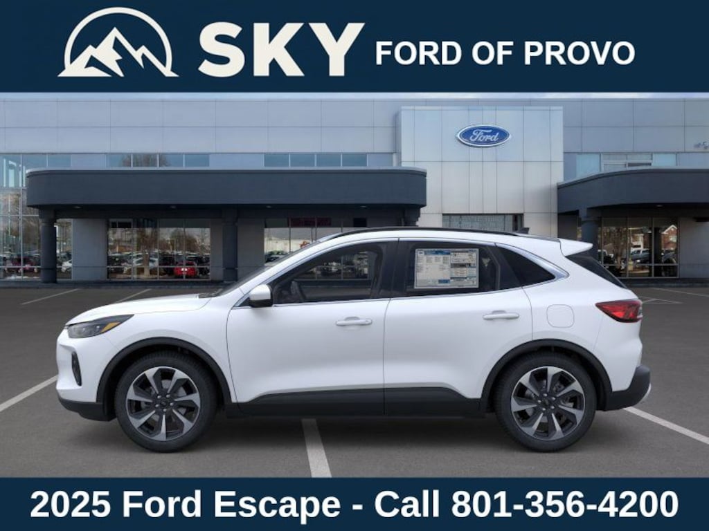 This 2025 Star White Metallic Tri-Coat Ford Escape Platinum AWD is well equipped and includes these features and benefits: AWD, 2.91 Axle Ratio, 4-Wheel Disc Brakes, 6 Speakers, ABS brakes, Air Conditioning, Alloy wheels, AM/FM radio: SiriusXM, AM/FM Stereo, Auto High-beam Headlights, Auto-dimming Rear-View mirror, Automatic temperature control, Brake assist, Bumpers: body-color, Compass, Delay-off headlights, Driver door bin, Driver vanity mirror, Dual front impact airbags, Dual front side impact airbags, Electronic Fuel Door Release, Electronic Stability Control, Emergency communication system: SYNC 4 911 Assist, FordPass Connect, Four wheel independent suspension, Front anti-roll bar, Front Bucket Seats, Front Center Armrest, Front dual zone A/C, Front fog lights, Front reading lights, Fully automatic headlights, Heated ActiveX Trimmed Front Sport Contour Bucket Seats, Heated door mirrors, Heated front seats, Heated steering wheel, Illuminated entry, Knee airbag, Low tire pressure warning, Memory seat, Navigation system: Connected Navigation, Neutral Towing Capability, Occupant sensing airbag, Outside temperature display, Overhead airbag, Overhead console, Panic alarm, Passenger door bin, Passenger vanity mirror, Pedestrian Alert Sounder, Power door mirrors, Power driver seat, Power Liftgate, Power passenger seat, Power steering, Power windows, Radio data system, Rear anti-roll bar, Rear reading lights, Rear seat center armrest, Rear window defroster, Rear window wiper, Remote keyless entry, Security system, Speed control, Speed-sensing steering, Speed-Sensitive Wipers, Split folding rear seat, Spoiler, Steering wheel mounted audio controls, SYNC 4 w/Enhanced Voice Recognition, Tachometer, Telescoping steering wheel, Tilt steering wheel, Traction control, Trip computer, Variably intermittent wipers, and Wheels: 19" Machined-Face Aluminum.