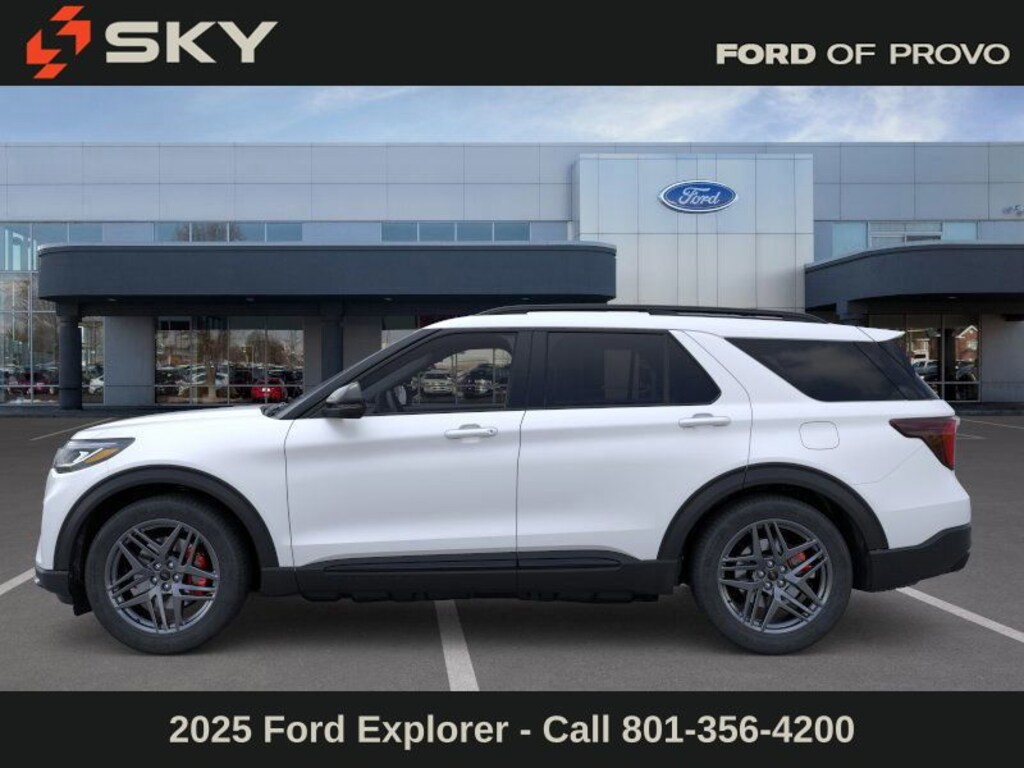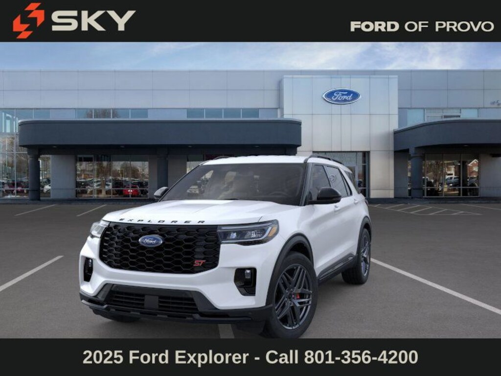 This 2025 Star White Metallic Tri-Coat Ford Explorer ST 4WD is well equipped and includes these features and benefits: Equipment Group 400A Standard Package, 4WD, 10 Speakers, 3.58 Non-Limited Slip Rear Axle, 3rd row seats: bench, 4-Wheel Disc Brakes, ABS brakes, Air Conditioning, Alloy wheels, AM/FM radio: SiriusXM with 360L, Apple CarPlay/Android Auto, Auto High-beam Headlights, Auto-dimming door mirrors, Auto-dimming Rear-View mirror, Automatic temperature control, Brake assist, Bumpers: body-color, Compass, Delay-off headlights, Driver door bin, Driver vanity mirror, Dual front impact airbags, Dual front side impact airbags, Electronic Stability Control, Emergency communication system: 911 Assist, Exterior Parking Camera Rear, Four wheel independent suspension, Front & 2nd Rows Floor Liners w/Carpet Floor Mats, Front anti-roll bar, Front Bucket Seats, Front Center Armrest, Front dual zone A/C, Front fog lights, Front License Plate Bracket, Front reading lights, Fully automatic headlights, Garage door transmitter, Heated door mirrors, Heated front seats, Heated rear seats, Heated steering wheel, Heated/Ventilated Miko Sport Captain's Chairs, Illuminated entry, Internet access capable: FordPass Connect 5G, Knee airbag, Leather steering wheel, Low tire pressure warning, Memory seat, Navigation System, Occupant sensing airbag, Outside temperature display, Overhead airbag, Overhead console, Panic alarm, Passenger door bin, Passenger vanity mirror, Power door mirrors, Power driver seat, Power Liftgate, Power passenger seat, Power steering, Power windows, Radio: B&O Sound System by Bang & Olufsen, Rain sensing wipers, Rear air conditioning, Rear anti-roll bar, Rear reading lights, Rear window defroster, Rear window wiper, Remote keyless entry, Security system, Speed control, Speed-sensing steering, Speed-Sensitive Wipers, Split folding rear seat, Spoiler, Sport steering wheel, Steering wheel mounted audio controls, Tachometer, Telescoping steering wheel, Tilt steering wheel, Traction control, Trip computer, Turn signal indicator mirrors, Variably intermittent wipers, Ventilated front seats, and Wheels: 21" Magnetite-Painted Aluminum.