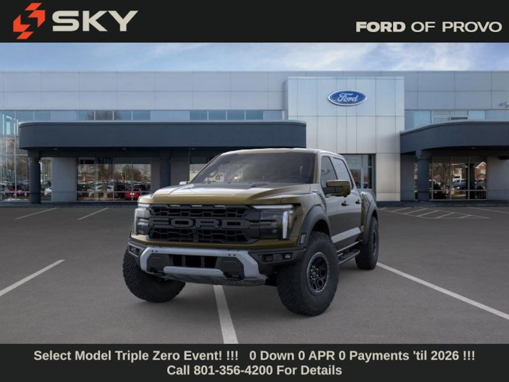 This 2025 Green Ford F-150 Raptor 4WD is well equipped and includes these features and benefits: 4WD, 14 Speakers, 17" Cast Aluminum Wheels, 4-Wheel Disc Brakes, ABS brakes, Adjustable pedals, Air Conditioning, Alloy wheels, AM/FM radio: SiriusXM with 360L, Auto High-beam Headlights, Auto tilt-away steering wheel, Auto-dimming door mirrors, Auto-dimming Rear-View mirror, Automatic temperature control, Brake assist, Bumpers: body-color, Compass, Delay-off headlights, Driver door bin, Driver vanity mirror, Dual front impact airbags, Dual front side impact airbags, Electronic Locking w/4.10 Axle Ratio, Electronic Stability Control, Emergency communication system: SYNC 4 911 Assist, Front anti-roll bar, Front Bucket Seats, Front Center Armrest, Front dual zone A/C, Front fog lights, Front reading lights, Front wheel independent suspension, Fully automatic headlights, Garage door transmitter, Heads-Up Display, Heated door mirrors, Heated front seats, Heated rear seats, Heated steering wheel, Illuminated entry, Lane Departure Warning System, Leather steering wheel, Leather Trimmed Seats, Low tire pressure warning, Memory seat, Navigation system: Connected Navigation, Occupant sensing airbag, Outside temperature display, Overhead airbag, Overhead console, Panic alarm, Passenger door bin, Passenger vanity mirror, Pedal memory, Power door mirrors, Power driver seat, Power passenger seat, Power steering, Power windows, Radio data system, Radio: B&O Unleashed Sound System by Bang & Olufsen, Rain sensing wipers, Rear reading lights, Rear step bumper, Rear window defroster, Remote keyless entry, Security system, Speed control, Speed-sensing steering, Split folding rear seat, Steering wheel memory, Steering wheel mounted audio controls, SYNC 4 w/Enhanced Voice Recognition, Tachometer, Telescoping steering wheel, Tilt steering wheel, Traction control, Trip computer, Turn signal indicator mirrors, Variably intermittent wipers, and Ventilated front seats.