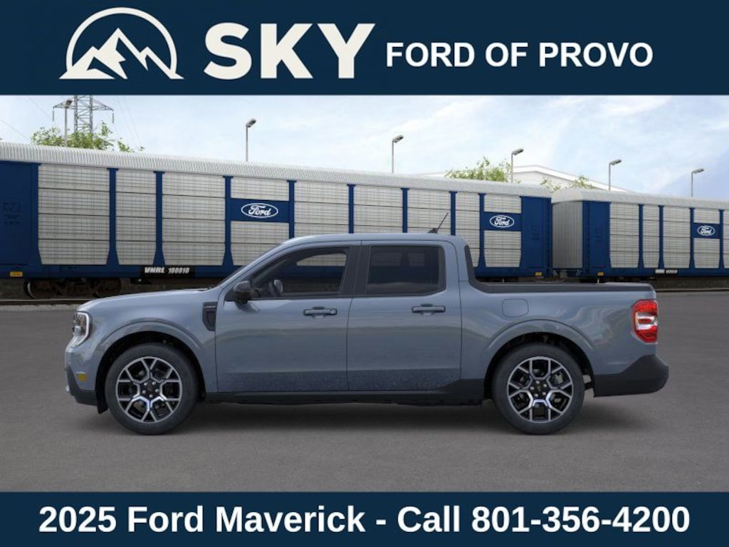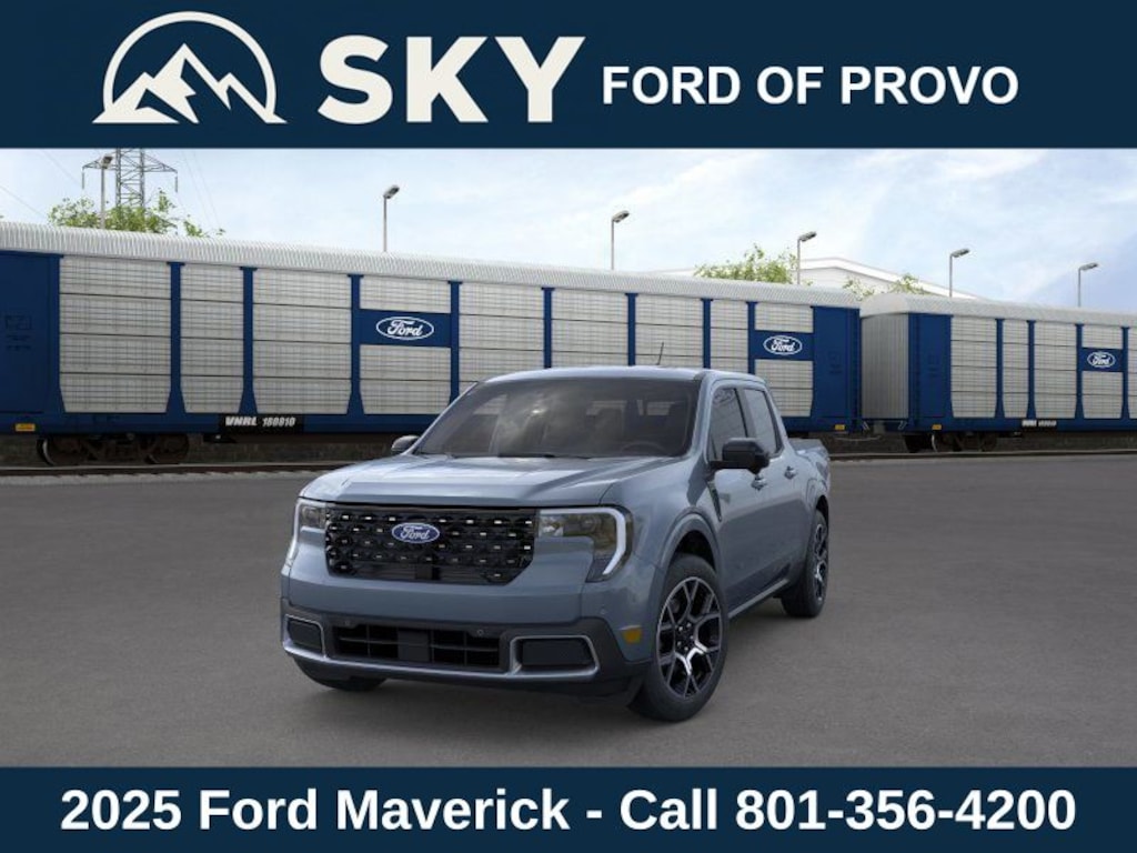 This 2025 Azure Gray Metallic Tri-Coat Ford Maverick Lariat AWD is well equipped and includes these features and benefits: 2.5L I-4 Hybrid, 2.91 Axle Ratio, 4-Wheel Disc Brakes, 8 Speakers, ABS brakes, ActiveX Trimmed Heated Front Bucket Seats, Air Conditioning, Alloy wheels, AM/FM radio: SiriusXM with 360L, Apple CarPlay/Android Auto, Auto High-beam Headlights, Automatic temperature control, Brake assist, Bumpers: body-color, Compass, Delay-off headlights, Driver door bin, Driver vanity mirror, Dual front impact airbags, Dual front side impact airbags, Electronic Stability Control, Emergency communication system: SYNC 4 911 Assist, Exterior Parking Camera Rear, Four wheel independent suspension, Front anti-roll bar, Front Bucket Seats, Front Center Armrest, Front dual zone A/C, Front reading lights, Fully automatic headlights, Heated door mirrors, Heated front seats, Heated steering wheel, Illuminated entry, Knee airbag, Low tire pressure warning, Navigation system: Connected Navigation, Occupant sensing airbag, Outside temperature display, Overhead airbag, Overhead console, Panic alarm, Passenger door bin, Passenger vanity mirror, Power door mirrors, Power driver seat, Power steering, Power windows, Radio data system, Radio: B&O Sound System by Bang & Olufsen, Rear anti-roll bar, Rear seat center armrest, Rear step bumper, Remote keyless entry, Security system, SiriusXM w/360L, Speed control, Speed-sensing steering, Steering wheel mounted audio controls, SYNC 4 w/Enhanced Voice Recognition, Telescoping steering wheel, Tilt steering wheel, Traction control, Trip computer, and Wheels: 19" Machined Painted Aluminum.