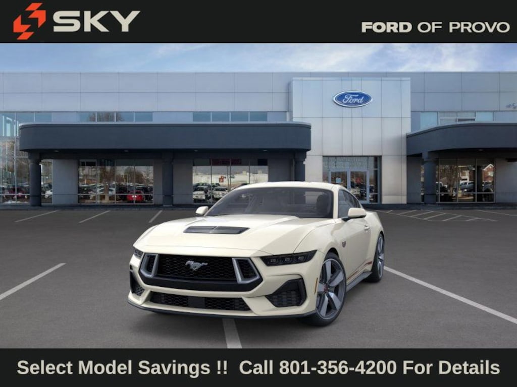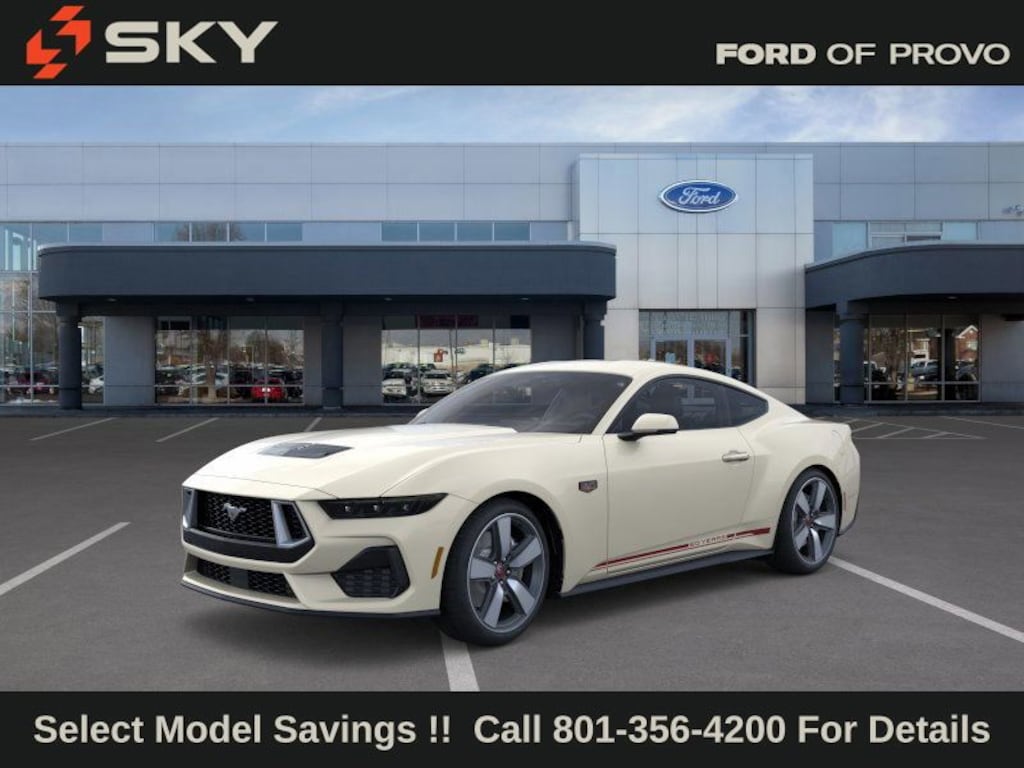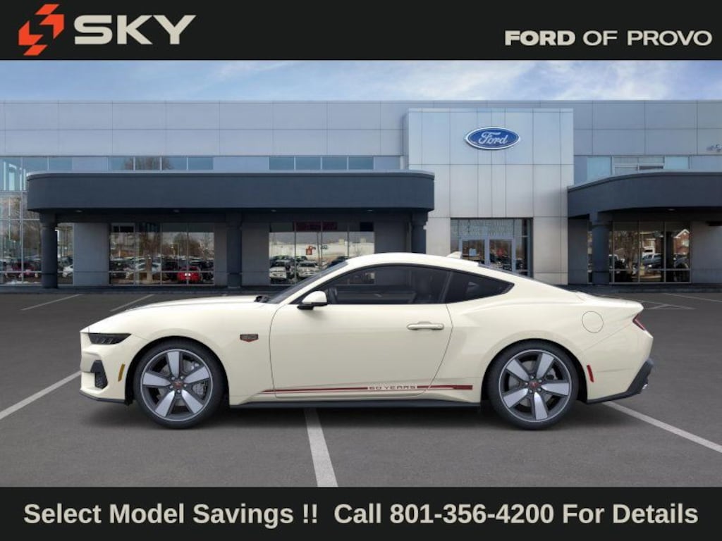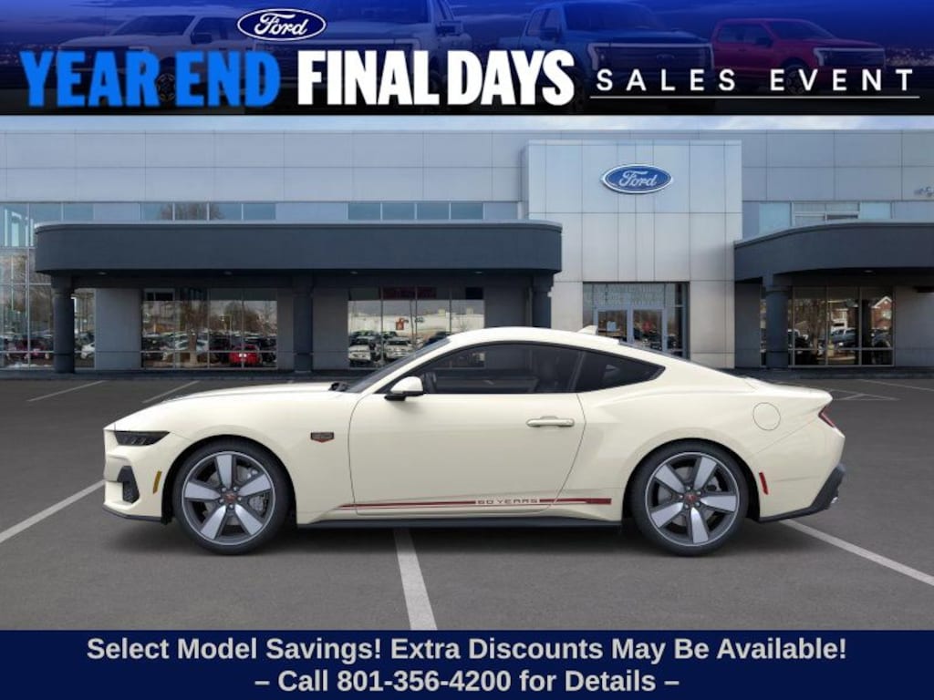 This 2025 Wimbledon White Ford Mustang GT Premium RWD is well equipped and includes these features and benefits: 60th Anniversary Package (20" Wheels, Anniversary Special Edition Badge, Headlamps w/Black Bezels, Painted High Gloss Black Honeycomb Grille, Silver Painted Mirror Caps, and Wheels: 20" x 9" Bright Machined Aluminum), Equipment Group 401A High Package (Driver Seat & Mirrors Memory, Illuminated Door-Sill Scuff Plates, Integrated Turn Signals, and Leather-Trimmed Bucket Seats w/Color Accents), Ford Co-Pilot360 Assist+ (Connected Navigation and Pre-Collision Assist w/Automatic Emergency Braking), Security Package (Active Anti-Theft System, Locking Center Console, and Wheel Locking Kit), Active Valve Performance Exhaust, B&O Sound System by Bang & Olufsen w/12 Speakers, Brembo Brake System, 3.55 Limited Slip Rear Axle, 4-Wheel Disc Brakes, ABS brakes, Air Conditioning, Alloy wheels, AM/FM Stereo, Auto High-beam Headlights, Automatic temperature control, Brake assist, Brembo Brake System w/Performance Linings, Bumpers: body-color, Compass, Delay-off headlights, Driver door bin, Driver vanity mirror, Dual front impact airbags, Dual front side impact airbags, Electronic Stability Control, Emergency communication system: 911 Assist, Exterior Parking Camera Rear, Four wheel independent suspension, Front anti-roll bar, Front Bucket Seats, Front Center Armrest, Front dual zone A/C, Front reading lights, Fully automatic headlights, Illuminated entry, Knee airbag, Leather Bucket Seats, Leather Shift Knob, Leather steering wheel, Low tire pressure warning, Occupant sensing airbag, Outside temperature display, Overhead airbag, Overhead console, Panic alarm, Passenger door bin, Passenger vanity mirror, Power door mirrors, Power steering, Power windows, Radio data system, Rain sensing wipers, Rear anti-roll bar, Rear Parking Sensors, Rear window defroster, Remote keyless entry, Speed control, Speed-sensing steering, Speed-Sensitive Wipers, Split folding rear seat, Spoiler, Sport steering wheel, Steering wheel mounted audio controls, SYNC 4, Tachometer, Telescoping steering wheel, Tilt steering wheel, Traction control, Trip computer, Variably intermittent wipers, and Voltmeter.