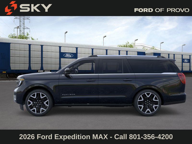 This 2026 Agate Black Metallic Ford Expedition Max Platinum 4WD is well equipped and includes these features and benefits: Ford Connectivity Package (1-Year Included), 10 Speakers, 2nd Row Power-Folding Captain's Chairs, 3.73 Axle Ratio, 3rd row seats: split-bench, 4-Wheel Disc Brakes, ABS brakes, Air Conditioning, Alloy wheels, AM/FM radio: SiriusXM with 360L, Apple CarPlay/Android Auto, Auto High-beam Headlights, Auto-dimming door mirrors, Auto-dimming Rear-View mirror, Automatic temperature control, Brake assist, Bumpers: body-color, Compass, Delay-off headlights, Driver door bin, Driver vanity mirror, Dual front impact airbags, Dual front side impact airbags, Electronic Stability Control, Emergency communication system: 911 Assist, Exterior Parking Camera Rear, Ford Digital Experience, Four wheel independent suspension, Front anti-roll bar, Front Bucket Seats, Front Center Armrest, Front dual zone A/C, Front reading lights, Fully automatic headlights, Garage door transmitter, Genuine wood dashboard insert, Genuine wood door panel insert, Heated and Ventilated Leather Front Captain's Chairs, Heated door mirrors, Heated front seats, Heated rear seats, Heated steering wheel, Illuminated entry, Leather steering wheel, Low tire pressure warning, Memory seat, Navigation System, Occupant sensing airbag, Outside temperature display, Overhead airbag, Overhead console, Panic alarm, Passenger door bin, Passenger vanity mirror, Power door mirrors, Power driver seat, Power moonroof: Vista Roof, Power passenger seat, Power steering, Power windows, Radio data system, Radio: B&O Sound System by Bang and Olufsen, Rain sensing wipers, Rear air conditioning, Rear anti-roll bar, Rear reading lights, Rear window defroster, Rear window wiper, Reclining 3rd row seat, Remote keyless entry, Security system, SiriusXM with 360L, Speed control, Speed-sensing steering, Speed-Sensitive Wipers, Split folding rear seat, Spoiler, Steering wheel memory, Steering wheel mounted audio controls, Tachometer, Telescoping steering wheel, Tilt steering wheel, Traction control, Trip computer, Turn signal indicator mirrors, Variably intermittent wipers, Ventilated front seats, Voltmeter, and Wheels: 20" x 8.5" Ebony Bright Machined Aluminum.