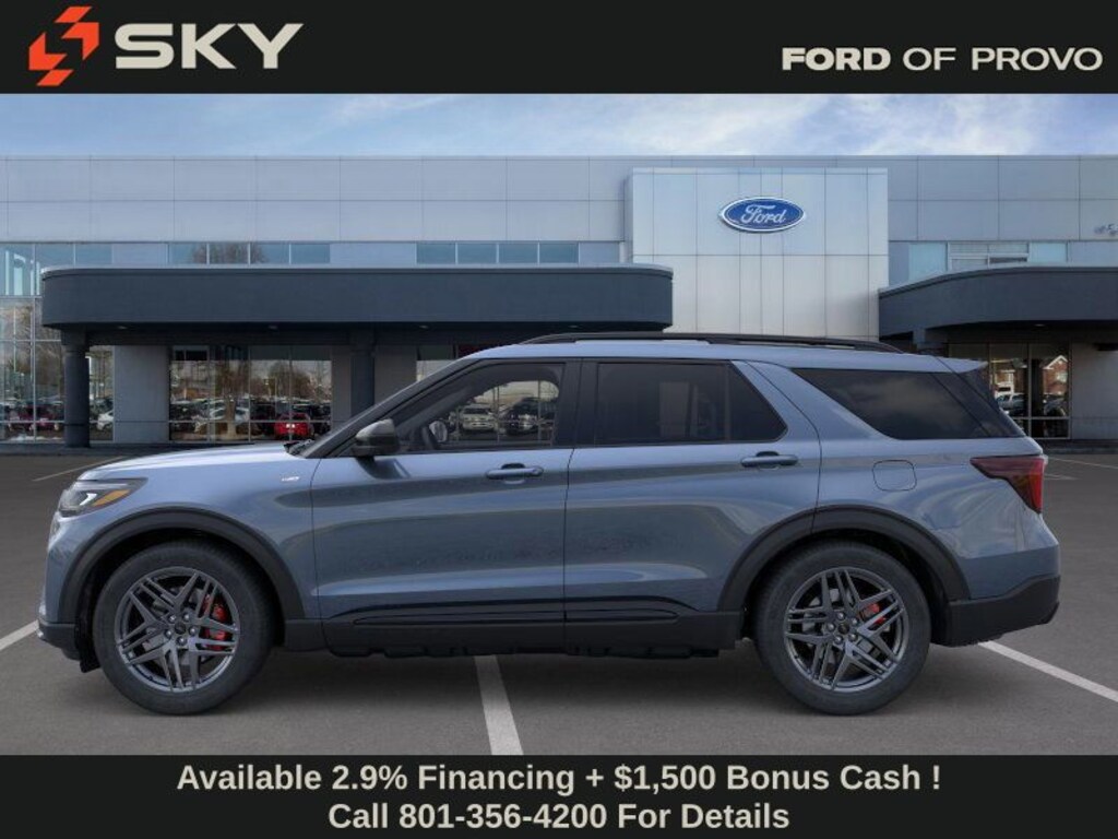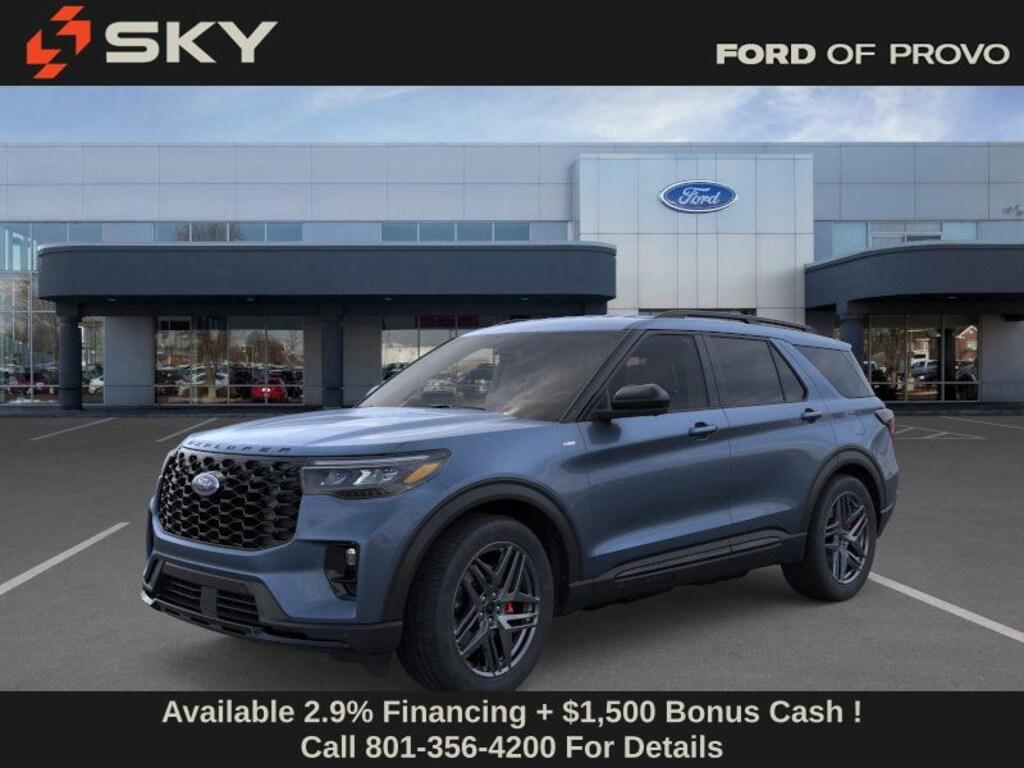 This 2026 Vapor Blue Metallic Ford Explorer ST-Line 4WD is well equipped and includes these features and benefits: 4WD, 10 Speakers, 3rd row seats: bench, 4-Wheel Disc Brakes, ABS brakes, Air Conditioning, Alloy wheels, AM/FM radio: SiriusXM with 360L, Apple CarPlay/Android Auto, Auto High-beam Headlights, Automatic temperature control, Brake assist, Bumpers: body-color, Compass, Delay-off headlights, Driver door bin, Driver vanity mirror, Dual front impact airbags, Dual front side impact airbags, Electronic Stability Control, Emergency communication system: 911 Assist, Exterior Parking Camera Rear, Four wheel independent suspension, Front anti-roll bar, Front Bucket Seats, Front Center Armrest, Front dual zone A/C, Front fog lights, Front reading lights, Fully automatic headlights, Garage door transmitter, Heated door mirrors, Heated front seats, Heated steering wheel, Heated Unique Cloth Captain's Chairs, Illuminated entry, Knee airbag, Leather steering wheel, Low tire pressure warning, Navigation System, Occupant sensing airbag, Outside temperature display, Overhead airbag, Overhead console, Panic alarm, Passenger door bin, Passenger vanity mirror, Power door mirrors, Power driver seat, Power Liftgate, Power passenger seat, Power steering, Power windows, Radio: B&O Sound System by Bang and Olufsen, Rear air conditioning, Rear anti-roll bar, Rear reading lights, Rear window defroster, Rear window wiper, Remote keyless entry, Security system, Speed control, Speed-sensing steering, Speed-Sensitive Wipers, Split folding rear seat, Spoiler, Steering wheel mounted audio controls, Tachometer, Telescoping steering wheel, Tilt steering wheel, Traction control, Trip computer, Variably intermittent wipers, and Wheels: 20" Ebony-Painted Machined Aluminum.