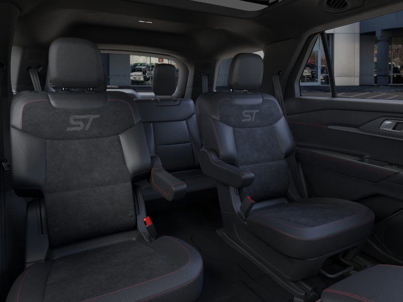 This 2026 Star White Metallic Tri-Coat Ford Explorer ST 4WD is well equipped and includes these features and benefits: 4WD, 10 Speakers, 3rd row seats: bench, 4-Wheel Disc Brakes, ABS brakes, Air Conditioning, Alloy wheels, AM/FM radio: SiriusXM with 360L, Apple CarPlay/Android Auto, Auto High-beam Headlights, Auto-dimming door mirrors, Auto-dimming Rear-View mirror, Automatic temperature control, Brake assist, Bumpers: body-color, Compass, Delay-off headlights, Driver door bin, Driver vanity mirror, Dual front impact airbags, Dual front side impact airbags, Electronic Stability Control, Emergency communication system: 911 Assist, Exterior Parking Camera Rear, Four wheel independent suspension, Front anti-roll bar, Front Bucket Seats, Front Center Armrest, Front dual zone A/C, Front fog lights, Front reading lights, Fully automatic headlights, Garage door transmitter, Heated door mirrors, Heated front seats, Heated rear seats, Heated steering wheel, Heated/Ventilated Miko Suede Captain's Chairs, Illuminated entry, Knee airbag, Leather steering wheel, Low tire pressure warning, Memory seat, Navigation System, Occupant sensing airbag, Outside temperature display, Overhead airbag, Overhead console, Panic alarm, Passenger door bin, Passenger vanity mirror, Power door mirrors, Power driver seat, Power Liftgate, Power passenger seat, Power steering, Power windows, Radio: B&O Sound System by Bang and Olufsen, Rain sensing wipers, Rear air conditioning, Rear anti-roll bar, Rear reading lights, Rear window defroster, Rear window wiper, Remote keyless entry, Security system, Speed control, Speed-sensing steering, Speed-Sensitive Wipers, Split folding rear seat, Spoiler, Sport steering wheel, Steering wheel mounted audio controls, Tachometer, Telescoping steering wheel, Tilt steering wheel, Traction control, Trip computer, Turn signal indicator mirrors, Variably intermittent wipers, Ventilated front seats, and Wheels: 21" Magnetite-Painted Aluminum.