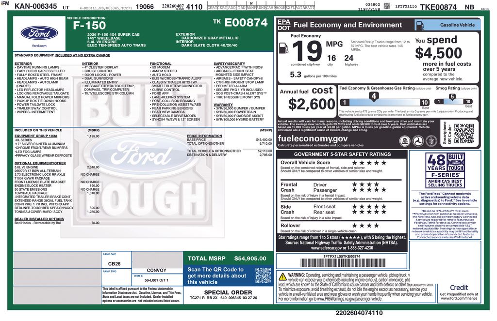 This 2026 Carbonized Gray Metallic Ford F-150 XL 4WD is well equipped and includes these features and benefits: Ford Connectivity Package (1-Year Included), GVWR: 6,550 lbs Payload Package, Internet access capable: 5G Modem - Ford Connectivity Package, 4WD, 3.55 Axle Ratio, 4-Wheel Disc Brakes, 6 Speakers, ABS brakes, Air Conditioning, AM/FM radio: SiriusXM with 360L, Auto High-beam Headlights, Brake assist, Cloth 40/20/40 Front Seat, Compass, Delay-off headlights, Driver door bin, Dual front impact airbags, Dual front side impact airbags, Electronic Stability Control, Emergency communication system: SYNC 4 911 Assist, Front anti-roll bar, Front Center Armrest, Front reading lights, Front wheel independent suspension, Fully automatic headlights, Heated door mirrors, Illuminated entry, Low tire pressure warning, Occupant sensing airbag, Outside temperature display, Overhead airbag, Overhead console, Panic alarm, Passenger door bin, Passenger vanity mirror, Power door mirrors, Power steering, Power windows, Radio data system, Radio: AM/FM Stereo with SiriusXM 360L, Rear step bumper, Remote keyless entry, Security system, Speed control, Split folding rear seat, Steering wheel mounted audio controls, SYNC 4 with Enhanced Voice Recognition, Tachometer, Telescoping steering wheel, Tilt steering wheel, Traction control, Trip computer, Variably intermittent wipers, and Wheels: 17" Silver Steel.