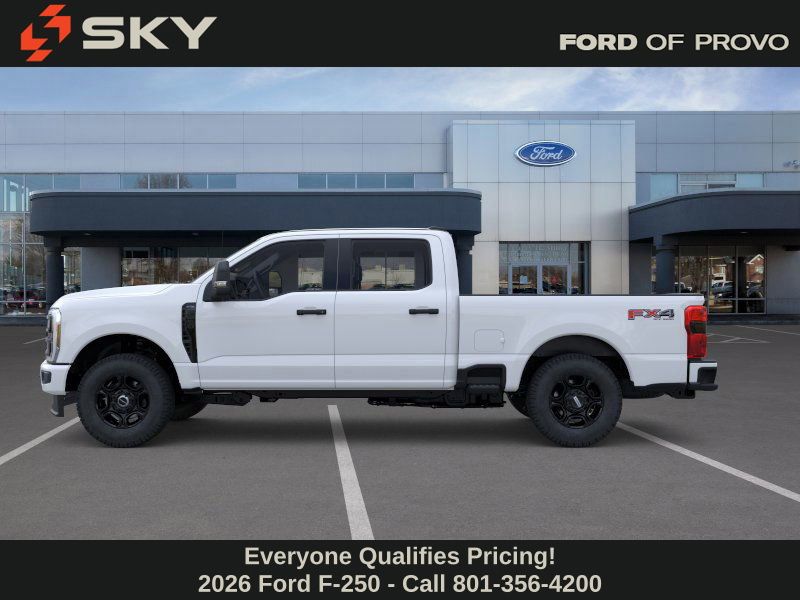 This 2026 Oxford White Ford F-250 SuperDuty XL 4WD is well equipped and includes these features and benefits: 5th Wheel/Gooseneck Hitch Prep Package, Ford Connectivity Package (1-Year Included), FX4 Off-Road Package (Hill Descent Control, Off-Road Specifically Tuned Shock Absorbers, and Unique FX4 Off-Road Box Decal), GVWR: 10,000 Lb Payload Package, Internet access capable: 5G Modem - Ford Connectivity Package, Order Code 600A (17" Argent Painted Steel Wheels, HD Vinyl 40/20/40 Split Bench Seat, Radio: AM/FM Stereo with MP3 Player, and SYNC 4), STX Appearance Package (Body-Color Front Bumper, Body-Color Rear Bumper, Cloth 40/20/40 Split Bench Seat, Color-Coordinated Full Carpet with Floor Mats, and Painted Grille), 4WD, 190 Amp Alternator, 4-Wheel Disc Brakes, 6 Speakers, ABS brakes, Air Conditioning, AM/FM radio, Brake assist, Compass, Delay-off headlights, Dual front impact airbags, Dual front side impact airbags, Electronic Stability Control, Emergency communication system: SYNC 4 911 Assist, Exterior Parking Camera Rear, Front anti-roll bar, Front Center Armrest w/Storage, Front reading lights, Fully automatic headlights, Heated door mirrors, Illuminated entry, Low tire pressure warning, Outside temperature display, Overhead airbag, Overhead console, Panic alarm, Passenger vanity mirror, Power door mirrors, Power steering, Power windows, Rear reading lights, Rear step bumper, Remote keyless entry, Remote Start System, Security system, Speed control, Split folding rear seat, Steering wheel mounted audio controls, Tachometer, Telescoping steering wheel, Tilt steering wheel, Traction control, Trailer Brake Controller, Trip computer, Turn signal indicator mirrors, Upfitter Switches (6), and Variably intermittent wipers.