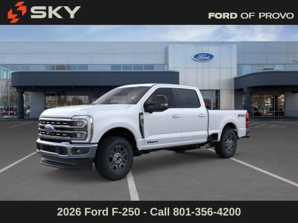 This 2026 Star White Metallic Tri-Coat Ford F-250 SuperDuty Lariat 4WD is well equipped and includes these features and benefits: 5th Wheel/Gooseneck Hitch Prep Package, F-250 >10K GVWR Package, Ford Connectivity Package (1-Year Included), FX4 Off-Road Package (Hill Descent Control, Off-Road Specifically Tuned Shock Absorbers, and Unique FX4 Off-Road Box Decal), High Capacity 11.6" Axle Upgrade Package, Internet access capable: 5G Modem - Ford Connectivity Package, Order Code 608A, 4WD, 4-Wheel Disc Brakes, 8 Speakers, ABS brakes, Adjustable pedals, Air Conditioning, Alloy wheels, AM/FM radio: SiriusXM with 360L, Auto High-beam Headlights, Auto-dimming Rear-View mirror, Automatic temperature control, BLIS w/Cross-Traffic Alert, Brake assist, Bumpers: chrome, Compass, Delay-off headlights, Driver door bin, Driver vanity mirror, Dual AGM 68 AH Battery, Dual front impact airbags, Dual front side impact airbags, Electronic Stability Control, Emergency communication system: SYNC 4 911 Assist, Flow-Through Console, Front ActiveX Trimmed 40/Console/40 Seats, Front anti-roll bar, Front Bucket Seats, Front Center Armrest, Front dual zone A/C, Front fog lights, Front License Plate Bracket, Front reading lights, Fully automatic headlights, Garage door transmitter, Heated door mirrors, Heated front seats, Heated rear seats, Heated steering wheel, Illuminated entry, Low tire pressure warning, Memory seat, Navigation system: Connected Navigation, Outside temperature display, Overhead airbag, Overhead console, Panic alarm, Passenger door bin, Passenger vanity mirror, Pedal memory, Power door mirrors, Power driver seat, Power passenger seat, Power steering, Power windows, Privacy Glass, Radio: B&O Sound System by Bang & Olufsen, Rain sensing wipers, Rear Parking Sensors, Rear reading lights, Rear seat center armrest, Rear step bumper, Rear window defroster, Remote keyless entry, Security system, SiriusXM w/360L, Speed control, Split folding rear seat, Steering wheel mounted audio controls, SYNC 4 w/Enhanced Voice Recognition, Tachometer, Telescoping steering wheel, Tilt steering wheel, Traction control, Trip computer, Turn signal indicator mirrors, Variably intermittent wipers, Ventilated front seats, and Wheels: 18" Bright Machined & Carbonized Gray Alum.