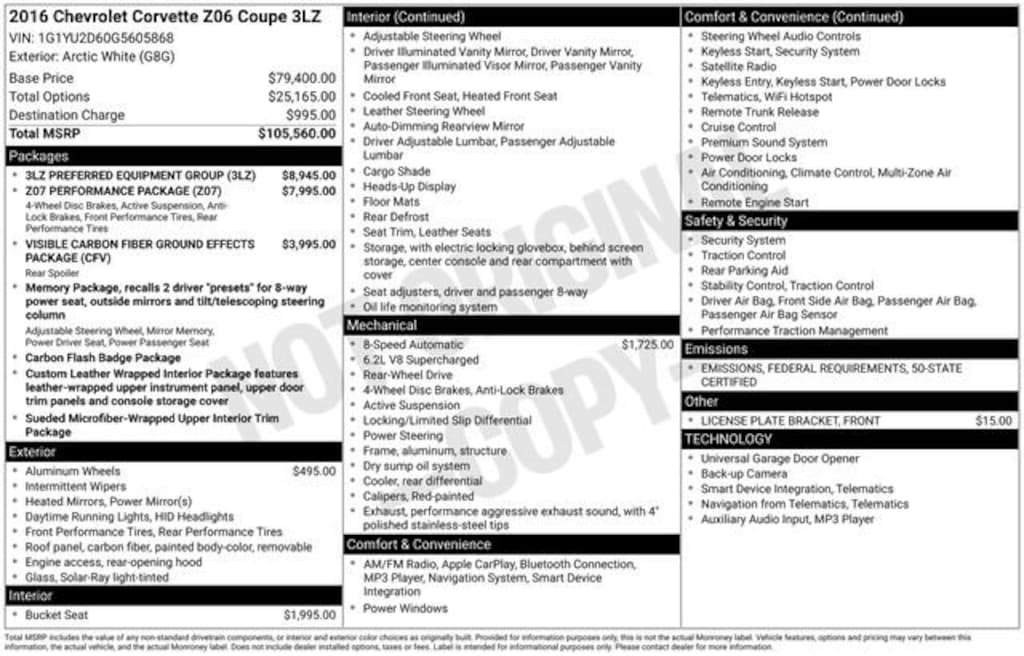 Used 2016 ChevroletCorvette Z06 Z06 3LZ Performance Engine, Gas, 8 Cylinders