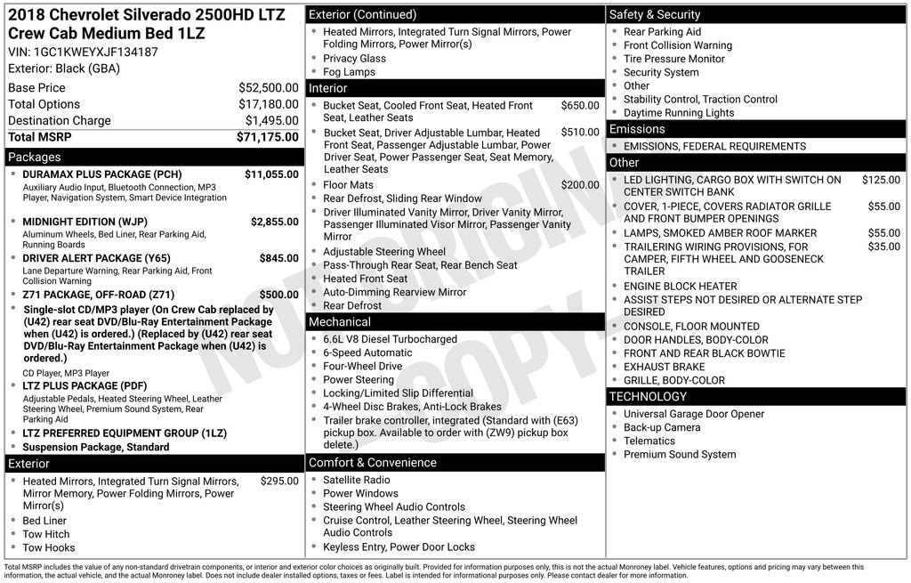 Black 2018 Chevrolet Silverado 2500HD LTZ 4WD Allison 1000 6-Speed Automatic Duramax 6.6L V8 Turbodiesel Allison 1000 6-Speed Automatic, 4WD, Jet Black Leather.Recent Arrival!Awards:* 2018 KBB.com 10 Most Awarded BrandsCheck out our 5 Star Google Reviews! Drive a little save a lot. Sale Price Includes $1,000 Finance Savings. Contact Dealer For Details.