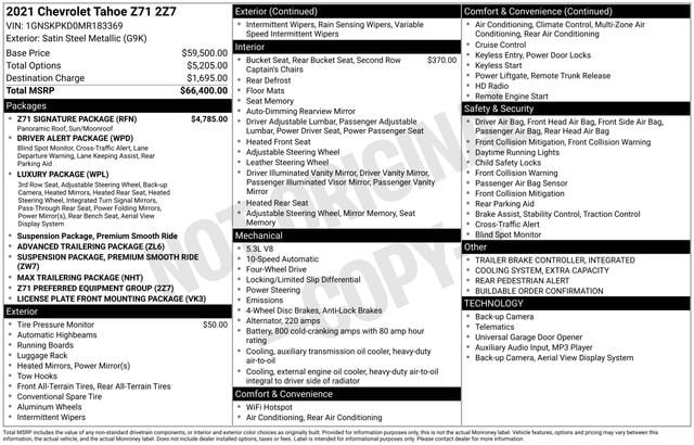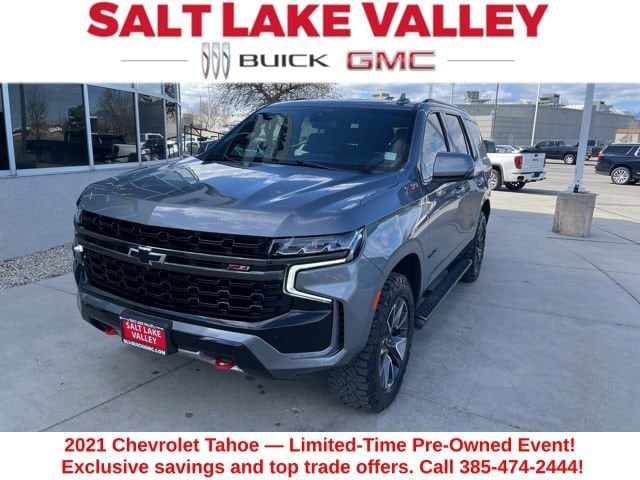 Take your drives to the next level with this Chevrolet Tahoe from Salt Lake Valley Buick GMC! Engineered for a smooth ride, advanced convenience, and lasting dependability, this vehicle is ready to handle everything your day throws at you. Price excludes tax, title, license fee, government fees, and $449 dealer documentary service fee. While every reasonable effort is made to ensure accuracy, we are not responsible for errors or omissions, and vehicles may be sold prior to inquiry please contact the dealer to confirm availability. All financing is subject to approved credit. Looking for quality used cars in Salt Lake City? This Chevrolet Tahoe delivers style, versatility, and value - perfect for daily commutes, family trips, or weekend adventures. Stop by Salt Lake Valley Buick GMC to see this vehicle in person and explore our wide selection of pre-owned cars, trucks, and SUVs. Browse online at www.slvbuickgmc.com or call 801-265-1511 to schedule your test drive today! With Advanced Trailering Package (Advanced Trailering System, Hitch Guidance w/Hitch View, and Integrated Trailer Brake Controller), Driver Alert Package (Front & Rear Park Assist, Lane Change Alert w/Side Blind Zone Alert, Lane Keep Assist w/Lane Departure Warning, and Rear Cross Traffic Alert), License Plate Front Mounting Package, Luxury Package (2nd Row Pwr Release 60/40 Split-Folding Bench Seat, 3rd Row 60/40 Power-Folding Split-Bench Seat, Automatic Heated Steering Wheel, HD Surround Vision, Heated 2nd Row Outboard Seats, Memory Settings, Outside Heated Power-Adjustable Mirrors, Power Tilt & Telescopic Steering Column, and Rear Pedestrian Alert), Max Trailering Package (Extra Capacity Cooling System), Preferred Equipment Group 2Z7 (1st & 2nd Row Color-Keyed Carpeted Floor Mats, 2 USB Data Ports, 2-Speed Active Electronic AutoTrac Transfer Case, Auto-Dimming Inside Rear-View Mirror, Black Tubular Assist Steps, Bright Front & Rear Door Sill Plates, Color-Keyed Carpeting Floor Covering, Driver & Front Outboard Passenger Airbags, Floor Console w/Storage Area, Front High-Approach Angle Fascia, Hands-Free Rear Power Programmable Liftgate, HD Radio, Hill Descent Control, Infotainment Display, Leather-Wrapped Steering Wheel, LED Daytime Running Lamps, Memory Settings for Driver, Red Horizontal-Mounted Recovery Hooks, Remote Start, SiriusXM Radio w/360L, and Universal Home Remote), Z71 Signature Package (DISC) (Dual-Pane Power Panoramic Sunroof), 10-Way Power Driver & Passenger Seat Adjusters, 3.23 Rear Axle Ratio, 3rd row seats: split-bench, 4-Wheel Disc Brakes, 9 Speakers, ABS brakes, Air Conditioning, Alloy wheels, AM/FM radio: SiriusXM with 360L, Apple CarPlay/Android Auto, Auto High-beam Headlights, Auto-dimming Rear-View mirror, Automatic temperature control, Bose 9-Speaker Stereo Audio System Feature, Brake assist, Bumpers: body-color, Compass, Delay-off headlights, Driver door bin, Driver vanity mirror, Dual front impact airbags, Dual front side impact airbags, Electronic Stability Control, Emergency communication system: OnStar and Chevrolet connected services capable, Four wheel independent suspension, Front anti-roll bar, Front Bucket Seats, Front Center Armrest, Front dual zone A/C, Front High-Back Reclining Bucket Seats, Front reading lights, Fully automatic headlights, Garage door transmitter, Heated door mirrors, Heated Driver & Front Passenger Seats, Heated front seats, Illuminated entry, Leather Seat Trim, Leather steering wheel, Low tire pressure warning, Memory seat, Occupant sensing airbag, Outside temperature display, Overhead airbag, Overhead console, Panic alarm, Passenger door bin, Passenger vanity mirror, Power door mirrors, Power driver seat, Power Liftgate, Power passenger seat, Power Release 2nd Row Bucket Seats, Power steering, Power windows, Premium audio system: Chevrolet Infotainment 3, Premium Smooth Ride Suspension, Radio: Chevrolet Infotainment 3 Plus System, Rain sensing wipers, R