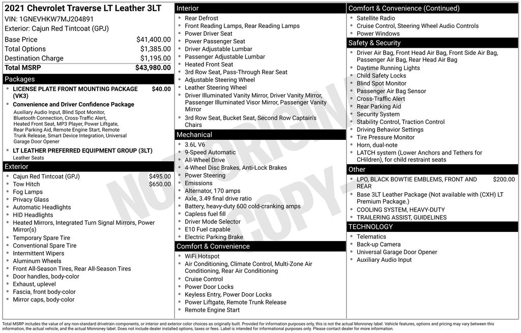 Cajun Red Tintcoat 2021 Chevrolet Traverse LT Leather AWD 9-Speed Automatic 3.6L V6 SIDI VVT AWD.