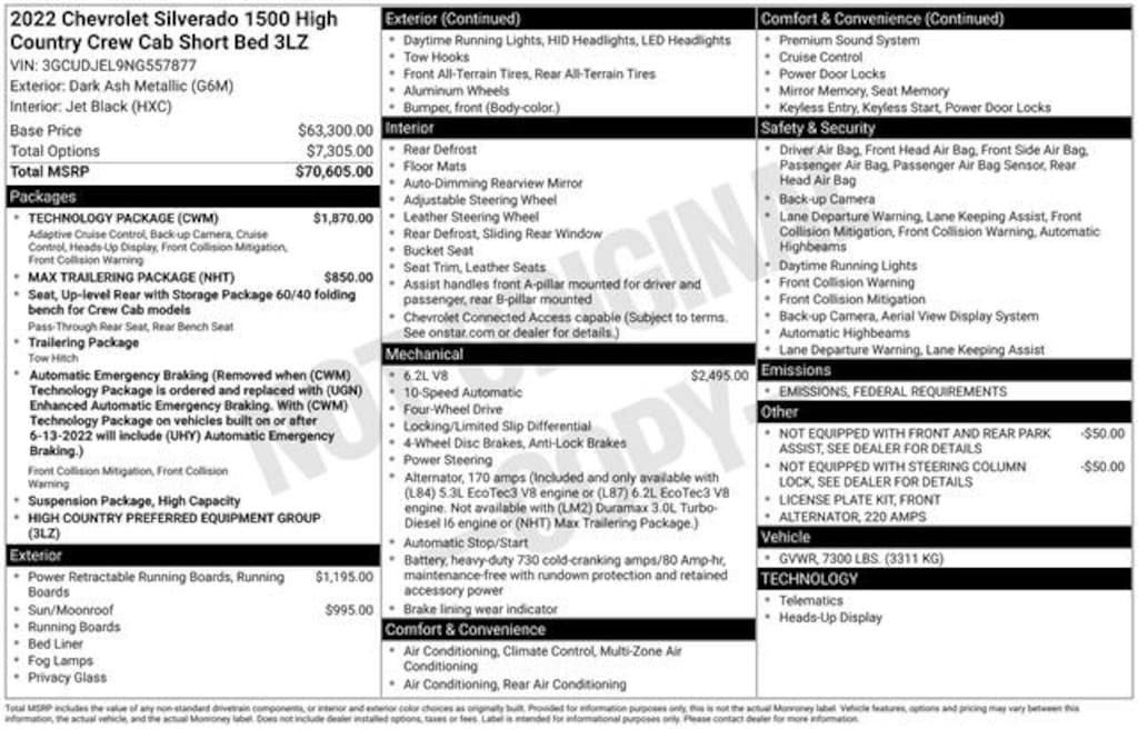 Take your drives to the next level with this Chevrolet Silverado 1500 from Salt Lake Valley Buick GMC! Engineered for a smooth ride, advanced convenience, and lasting dependability, this vehicle is ready to handle everything your day throws at you. Plus, enjoy a $1,000 finance savings, already included in the sale price, when you finance through one of our trusted lending partners. Looking for quality used cars in Salt Lake City? This Chevrolet Silverado 1500 delivers style, versatility, and value - perfect for daily commutes, family trips, or weekend adventures. Stop by Salt Lake Valley Buick GMC to see this vehicle in person and explore our wide selection of pre-owned cars, trucks, and SUVs. Browse online at www.slvbuickgmc.com or call 801-265-1511 to schedule your test drive today! With High Capacity Suspension Package, Max Trailering Package (Enhanced Cooling Radiator, Heavier Duty Rear Springs, and Increased RGAWR), Preferred Equipment Group 3LZ (10-Way Power Driver Seat w/Lumbar, 10-Way Power Passenger Seat Adjuster w/Lumbar, 12.3 Multicolor Reconfigurable Digital Display, 120-Volt Bed Mounted Power Outlet, 120-Volt Instrument Panel Power Outlet, 2 USB Data Ports, 2nd Row Heated Outboard Seats, Auto-Dimming Inside Rear-View Mirror, Auto-Locking Rear Differential, Bed View Camera, Bluetooth® For Phone, Body-Color Painted Mirror Caps, Chevrolet Connected Access Capable, Chevytec Spray-On Black Bedliner, Chrome Assist Steps, Chrome Recovery Hooks, Color-Keyed Carpeting Floor Covering, Compass, Deep-Tinted Glass, Driver Memory, Dual Exhaust w/Polished Outlets, Dual Rear USB Ports (Charge Only), Electric Rear-Window Defogger, Electrical Steering Column Lock, Electronic Cruise Control, Floor Mounted Center Console, Front Carpeted Floor Mats, Front LED Fog Lamps, Front Rainsensing Wipers, HD Surround Vision, Heated Driver & Front Outboard Passenger Seats, Heated Steering Wheel, Hitch Guidance w/Hitch View, Integrated Trailer Brake Controller, Keyless Open & Start, Leather Wrapped Steering Wheel, LED Cargo Area Lighting, OnStar & Chevrolet Connected Services Capable, Outside Heated Power-Adjustable Mirrors, Perimeter Lighting, Power Front Passenger Windows w/Express Up/Down, Power Front Windows w/Driver Express Up/Down, Power Rear Windows w/Express Down, Power Sliding Rear Window w/Rear Defogger, Power Tailgate, Power Tilt & Telescoping Steering Column, Rear Carpeted Floor Mats, Rear Cross Traffic Alert-Braking, Rear Pedestrian Detection, Rear Wheelhouse Liners, Remote Vehicle Starter System, Safety Alert Seat, SiriusXM w/360L, Standard Tailgate, Steering Wheel Audio Controls, Theft Deterrent System (Unauthorized Entry), Trailer Camera Provisions, Trailer Side Blind Zone Alert, Trailering App, Ultrasonic Front & Rear Park Assist, Universal Home Remote, Ventilated Driver & Front Passenger Seats, Wi-Fi Hot Spot Capable, Wireless Charging, and Wireless Phone Projection), Technology Package (15 Diagonal Multicolor Head-Up Display, Adaptive Cruise Control, Enhanced Automatic Emergency Braking, and Rear Camera Mirror), Trailering Package (Hitch Guidance), Up-Level Rear Seat w/Storage Package, 170 Amp Alternator, 220 Amp Alternator, 4-Wheel Disc Brakes, 7 Speakers, ABS brakes, Air Conditioning, Alloy wheels, AM/FM radio: SiriusXM with 360L, Apple CarPlay/Android Auto, Auto High-beam Headlights, Auto-dimming door mirrors, Auto-dimming Rear-View mirror, Automatic Emergency Braking, Automatic temperature control, Bodyside moldings, Brake assist, Bumpers: body-color, Delay-off headlights, Driver door bin, Driver vanity mirror, Dual front impact airbags, Dual front side impact airbags, Electronic Stability Control, Electronic Transmission Range Selector Shifter, Following Distance Indicator, Forward Collision Alert, Front anti-roll bar, Front Bucket Seats, Front Center Armrest, Front dual zone A/C, Front fog lights, Front License Plate Kit, Front Pedestrian Braking, Front reading lights, Front wheel independent suspension, Fully automati