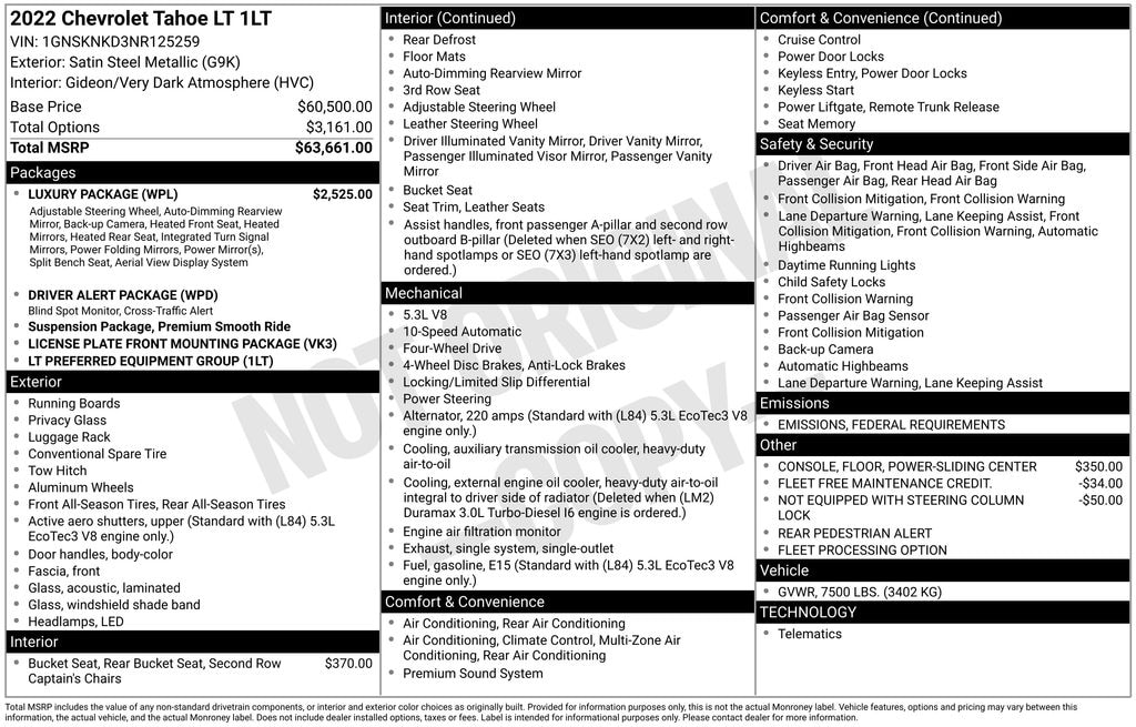Satin Steel Metallic 2022 Chevrolet Tahoe LT 4WD 10-Speed Automatic with Overdrive EcoTec3 5.3L V8 4WD, Gideon/Very Dark Atmosphere Leather.
