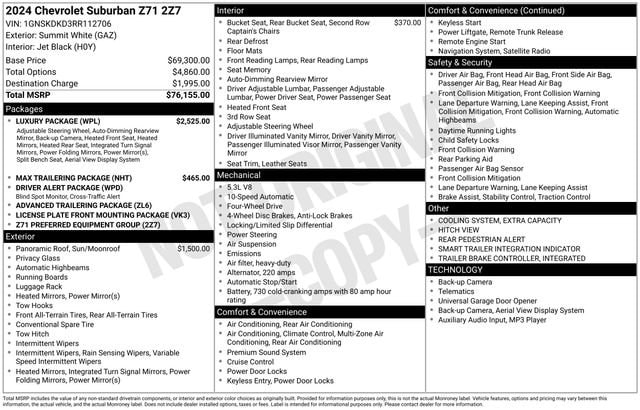 Take your drives to the next level with this Chevrolet Suburban from Salt Lake Valley Buick GMC! Engineered for a smooth ride, advanced convenience, and lasting dependability, this vehicle is ready to handle everything your day throws at you. Plus, enjoy a $1,000 finance savings, already included in the sale price, when you finance through one of our trusted lending partners. Looking for quality used cars in Salt Lake City? This Chevrolet Suburban delivers style, versatility, and value - perfect for daily commutes, family trips, or weekend adventures. Stop by Salt Lake Valley Buick GMC to see this vehicle in person and explore our wide selection of pre-owned cars, trucks, and SUVs. Browse online at www.slvbuickgmc.com or call 801-265-1511 to schedule your test drive today! With Advanced Trailering Package (Hitch View w/Pan/Zoom Image Adjustment, Integrated Trailer Brake Controller, and Smart Trailer Integration Indicator), Driver Alert Package (Lane Change Alert w/Side Blind Zone Alert and Rear Cross Traffic Alert), License Plate Front Mounting Package, Luxury Package (2nd Row Pwr Release 60/40 Split-Folding Bench Seat, 3rd Row 60/40 Power-Folding Split-Bench, HD Surround Vision, Heated 2nd Row Outboard Seats, Heated Steering Wheel, Memory Settings, Outside Heated Power-Adjustable Mirrors, Power Tilt & Telescopic Steering Column, and Rear Pedestrian Alert), Max Trailering Package (Extra Capacity Cooling System), Preferred Equipment Group 2Z7 (10-Way Power Driver & Passenger Seat Adjusters, 1st & 2nd Row Color-Keyed Carpeted Floor Mats, 2-Speed Active Electronic AutoTrac Transfer Case, Auto-Dimming Inside Rear-View Mirror, Black Tubular Assist Steps, Bose 9-Speaker Stereo Audio System Feature, Bright Front & Rear Door Sill Plates, Color-Keyed Carpeting Floor Covering, Driver & Front Outboard Passenger Airbags, Enhanced Driver Information Center, Floor Console w/Storage Area, Front High-Approach Angle Fascia, Hands-Free Rear Power Programmable Liftgate, Heated Driver & Front Passenger Seats, Heavy-Duty Air Filter, Hill Descent Control, Infotainment Display, LED Daytime Running Lamps, Memory Settings For Driver, Red Recovery Hooks, Remote Start, SiriusXM w/360L, Universal Home Remote, Wireless Charging, and Wrapped Steering Wheel), 3.23 Rear Axle Ratio, 3rd row seats: split-bench, 4-Wheel Disc Brakes, 9 Speakers, ABS brakes, Air Conditioning, Alloy wheels, AM/FM radio: SiriusXM with 360L, Apple CarPlay/Android Auto, Auto High-beam Headlights, Auto-dimming Rear-View mirror, Automatic temperature control, Brake assist, Bumpers: body-color, Compass, Delay-off headlights, Driver door bin, Driver vanity mirror, Dual front impact airbags, Dual front side impact airbags, Dual-Pane Power Panoramic Sunroof, Electronic Stability Control, Emergency communication system: OnStar and Chevrolet connected services capable, Four wheel independent suspension, Front anti-roll bar, Front Bucket Seats, Front Center Armrest, Front dual zone A/C, Front reading lights, Fully automatic headlights, Garage door transmitter, Heated door mirrors, Heated front seats, Illuminated entry, Leather-Appointed Seating, Low tire pressure warning, Memory seat, Navigation System, Occupant sensing airbag, Outside temperature display, Overhead airbag, Overhead console, Panic alarm, Passenger door bin, Passenger vanity mirror, Power door mirrors, Power driver seat, Power Liftgate, Power passenger seat, Power Release 2nd Row Bucket Seats, Power steering, Power windows, Premium audio system: Chevrolet Infotainment 3 Premium, Premium Smooth Ride Suspension, Radio: Chevrolet Infotainment 3 Premium System, Rain sensing wipers, Rear air conditioning, Rear anti-roll bar, Rear reading lights, Rear seat center armrest, Rear window defroster, Rear window wiper, Remote keyless entry, Roof rack: xxxxxx, Security system, Speed control, Speed-sensing steering, Split folding rear seat, Spoiler, Steering wheel mounted audio controls, Tach