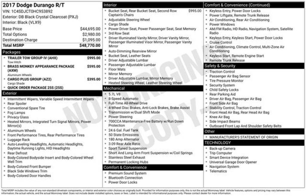 Get ready to hit the road in this Dodge Durango, a standout choice for drivers looking for reliability, performance, and style! This impressive vehicle is packed with premium features designed to make every drive more enjoyable. Plus, youâll enjoy a $1,000 finance savings, already included in the sale price, when you finance through one of our trusted lending partners. Whether youâre searching for used cars in Salt Lake City, a dependable SUV, or a powerful truck, this Dodge Durango delivers everything you need and more. Visit Salt Lake Valley Chrysler Dodge Jeep Ram today to test drive or explore our entire selection of quality pre-owned vehicles. Donât wait - shop online at www.slvcdjr.com or call 801-484-8755 to learn more! This amazing vehicle comes loaded with options like Brass Monkey Appearance Package (Gloss Black Badges, Gloss Black Grille, and Wheels: 20" x 8.0" Brass Monkey), Cargo Plus Group (Cargo Compartment Cover and Integrated Roof Rail Crossbars), Quick Order Package 25S, Trailer Tow Group IV (7 & 4 Pin Wiring Harness, Class IV Receiver Hitch, Heavy-Duty Engine Cooling, and Rear Load Leveling Suspension), 10 Speakers, 2nd Row Mini Console w/Cupholders, 2nd Row Seat Mounted Inboard Armrests, 3.09 Rear Axle Ratio, 3rd Row Floor Mat & Mini Console, 3rd row seats: split-bench, 4-Wheel Disc Brakes, ABS brakes, Air Conditioning, Alloy wheels, AM/FM radio: SiriusXM, Anti-whiplash front head restraints, Audio memory, Auto-dimming door mirrors, Auto-dimming Rear-View mirror, Auto-leveling suspension, Automatic temperature control, Black Roof Rails (DISC), Brake assist, Bumpers: body-color, Compass, Delay-off headlights, Driver door bin, Driver vanity mirror, Dual front impact airbags, Dual front side impact airbags, Dual Rear Exhaust w/Bright Tips, Electronic Stability Control, Emergency communication system: Uconnect Access, Exterior Parking Camera Rear, Four wheel independent suspension, Front anti-roll bar, Front Bucket Seats, Front Center Armrest w/Storage, Front dual zone A/C, Front fog lights, Front reading lights, Fully automatic headlights, Garage door transmitter, Heated door mirrors, Heated front seats, Heated rear seats, Heated steering wheel, High-Intensity Discharge Headlights, Illuminated entry, Knee airbag, Low tire pressure warning, Lux Leather Trimmed Bucket Seats, Manufacturer's Statement of Origin, Memory seat, Navigation system: Garmin, Occupant sensing airbag, Outside temperature display, Overhead airbag, Overhead console, Panic alarm, Passenger door bin, Passenger vanity mirror, Power 8-Way Driver Memory 8-Way Passenger Seats, Power door mirrors, Power driver seat, Power Liftgate, Power passenger seat, Power steering, Power windows, Radio data system, Radio: Uconnect 3C Nav w/8.4" Display, Rear air conditioning, Rear anti-roll bar, Rear reading lights, Rear seat center armrest, Rear window defroster, Rear window wiper, Remote keyless entry, Security system, Speed control, Speed-Sensitive Wipers, Split folding rear seat, Spoiler, Steering wheel mounted audio controls, Tachometer, Telescoping steering wheel, Tilt steering wheel, Traction control, Trip computer, Turn signal indicator mirrors, Variably intermittent wipers, Ventilated front seats, and Wheels: 20" x 8.0" Low Gloss Granite Crystal, making it the perfect choice for your next adventure.