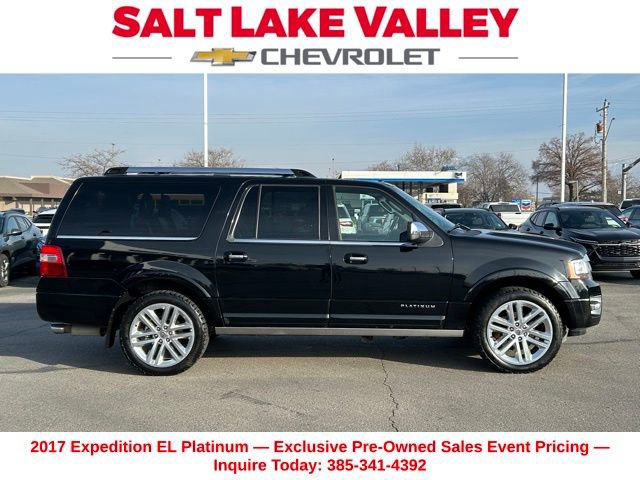 Turn every drive into something special with this Ford Expedition EL from Salt Lake Valley Chevrolet! Designed for comfort, performance, and style, this vehicle comes fully equipped with modern technology and convenience features youâll love. Plus, enjoy a $1,000 finance savings, already included in the sale price, when you finance through one of our trusted lending partners. If youâre shopping for used cars in Salt Lake City, or searching for the perfect SUV, truck, or sedan, this Ford Expedition EL delivers the dependability and value youâre looking for. Itâs the ideal match for your lifestyle - ready for everything from mountain adventures to city commutes. Visit Salt Lake Valley Chevrolet today and see why so many Utah drivers trust us for great deals on quality pre-owned vehicles. Explore our inventory online at www.slvchevy.com or call 801-969-8221 to schedule your test drive today! This impressive vehicle includes Equipment Group 600A (Power Moonroof, Power-Deployable Running Boards, and Voice-Activated Touch-Screen Navigation System), GVWR: 7,760 lbs Payload Package, 12 Speakers, 22 Polished Aluminum Wheels, 3rd row seats: split-bench, 4-Wheel Disc Brakes, ABS brakes, Adaptive suspension, Adjustable pedals, Air Conditioning, All-Weather Floor Mats (RPO), Alloy wheels, AM/FM radio: SiriusXM, Auto-dimming door mirrors, Auto-dimming Rear-View mirror, Automatic temperature control, Brake assist, Bumpers: body-color, CD player, Compass, Delay-off headlights, Driver door bin, Driver vanity mirror, Dual front impact airbags, Dual front side impact airbags, Electronic Stability Control, Emergency communication system: 911 Assist, Exterior Parking Camera Rear, Four wheel independent suspension, Front anti-roll bar, Front Bucket Seats, Front Center Armrest, Front dual zone A/C, Front fog lights, Front reading lights, Fully automatic headlights, Garage door transmitter, Heated & Cooled Perforated Leather Fr Bucket Seats, Heated door mirrors, Heated front seats, Heated rear seats, Illuminated entry, Leather Shift Knob, License Plate Bracket, Limited Slip w/3.73 Axle Ratio, Low tire pressure warning, Memory seat, Navigation System, Occupant sensing airbag, Outside temperature display, Overhead airbag, Overhead console, Panic alarm, Passenger door bin, Passenger vanity mirror, Pedal memory, Power door mirrors, Power driver seat, Power Liftgate, Power moonroof, Power passenger seat, Power steering, Power windows, Radio data system, Radio: Premium Sony Sound System w/Single-Disc/MP3, Rain sensing wipers, Rear air conditioning, Rear anti-roll bar, Rear audio controls, Rear reading lights, Rear window defroster, Rear window wiper, Remote keyless entry, Roof rack, Security system, SiriusXM Satellite Radio, Speed control, Speed-sensing steering, Speed-Sensitive Wipers, Split folding rear seat, Steering wheel mounted audio controls, SYNC 3 Communications & Entertainment System, Tachometer, Telescoping steering wheel, Tilt steering wheel, Traction control, Trip computer, Turn signal indicator mirrors, Variably intermittent wipers, Ventilated front seats, and Voltmeter, offering everything you need for your next adventure.