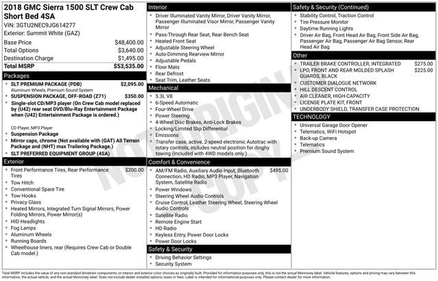 Take your drives to the next level with this GMC Sierra 1500 from Salt Lake Valley Buick GMC! Engineered for a smooth ride, advanced convenience, and lasting dependability, this vehicle is ready to handle everything your day throws at you. Plus, enjoy a $1,000 finance savings, already included in the sale price, when you finance through one of our trusted lending partners. Looking for quality used cars in Salt Lake City? This GMC Sierra 1500 delivers style, versatility, and value - perfect for daily commutes, family trips, or weekend adventures. Stop by Salt Lake Valley Buick GMC to see this vehicle in person and explore our wide selection of pre-owned cars, trucks, and SUVs. Browse online at www.slvbuickgmc.com or call 801-265-1511 to schedule your test drive today! With Off-Road Suspension Package (Hill Descent Control), Preferred Equipment Group 4SA (110-Volt AC Power Outlet, 150 Amp Alternator, 1st & 2nd Row Color-Keyed Carpeted Floor Mats, 2-Speed Active Electronic AutoTrac Transfer Case, 4.2 Diagonal Color Display Driver Info Center, Auto-Dimming Inside Rear-View Mirror, Auxiliary External Transmission Oil Cooler, Chrome Bodyside Moldings, Chrome Door Handles, Chrome Mirror Caps, Color-Keyed Carpeting, Deep-Tinted Glass, Driver & Front Passenger Illuminated Vanity Mirrors, Dual-Zone Automatic Climate Control, Electric Rear-Window Defogger, EZ Lift & Lower Tailgate, Front Frame-Mounted Black Recovery Hooks, GMC 4G LTE, GMC Connected Access, Heavy-Duty Rear Locking Differential, Leather Wrapped Steering Wheel w/Cruise Controls, LED Cargo Box Lighting, LED Tailamps w/Signature, Manual Tilt/Telescoping Steering Column, OnStar & GMC Connected Services Capable, Power Adjustable Pedals, Power Folding & Adjustable Heated Outside Mirrors, Power Windows w/Driver Express Up & Down, Rear 60/40 Folding Bench Seat (Folds Up), Rear Wheelhouse Liners, Remote Keyless Entry, Remote Locking Tailgate, Remote Vehicle Starter System, Single Slot CD/MP3 Player, Steering Wheel Audio Controls, Theft Deterrent System (Unauthorized Entry), Thin Profile LED Fog Lamps, and Universal Home Remote), SLT Premium Package (20 x 9 Polished Aluminum Wheels, 6 Rectangular Chromed Tubular Assist Steps, and Bose Speaker System), Trailering Equipment, 10-Way Power Driver's Seat Adjuster, 4-Wheel Disc Brakes, 40/20/40 Front Split Bench Seat, 6 Speakers, 6-Speaker Audio System, ABS brakes, Adjustable pedals, Air Conditioning, Alloy wheels, AM/FM radio: SiriusXM, Auto-dimming door mirrors, Auto-dimming Rear-View mirror, Automatic temperature control, Bodyside moldings, Brake assist, Bumpers: chrome, CD player, Compass, Delay-off headlights, Driver door bin, Driver vanity mirror, Dual front impact airbags, Dual front side impact airbags, Electronic Stability Control, Exterior Parking Camera Rear, Front & Rear Molded Black Splash Guards (LPO), Front anti-roll bar, Front Center Armrest w/Storage, Front dual zone A/C, Front fog lights, Front License Plate Kit, Front reading lights, Front wheel independent suspension, Fully automatic headlights, Garage door transmitter, HD Radio, Heated door mirrors, Heated Driver & Front Passenger Seats, Heated front seats, Heavy Duty Suspension, High-Intensity Discharge Headlights, Illuminated entry, Integrated Trailer Brake Controller, Leather Appointed Seat Trim, Low tire pressure warning, Memory seat, Occupant sensing airbag, Outside temperature display, Overhead airbag, Overhead console, Panic alarm, Passenger door bin, Passenger vanity mirror, Power door mirrors, Power driver seat, Power passenger seat, Power steering, Power windows, Premium audio system: GMC Infotainment System, Radio data system, Radio: AM/FM/GMC Infotainment & Navigation, Radio: AM/FM/GMC Infotainment System, Rear reading lights, Rear seat center armrest, Rear step bumper, Rear window defroster, Remote keyless entry, Security system, SiriusXM Satellite Radio, Speed control, Speed-sensing steering, Split foldin