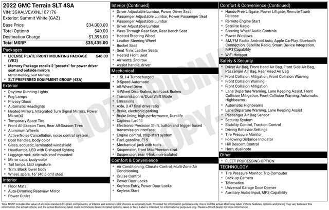 The 2022 GMC Terrain SLT is a sophisticated and capable SUV that's ready to elevate your driving experience. With its sleek exterior, premium interior, and impressive performance, this Terrain is the perfect blend of style and substance.Key features of this Terrain SLT include:- GM Certified- License Plate Front Mounting Package- Preferred Equipment Group 4SAStep inside and you'll be greeted by a spacious and well-appointed cabin, featuring perforated leather-appointed seats, a heated steering wheel, and a host of advanced technology. The 8-inch infotainment display with wireless Apple CarPlay and Android Auto integration keeps you connected and entertained on the go.Under the hood, the 1.5L DOHC engine and 9-speed automatic transmission deliver a smooth and efficient driving experience, with an EPA-estimated 25 city/28 highway MPG. The available all-wheel-drive system provides confident handling in all weather conditions.Safety is a top priority, with features like lane departure warning, automatic high-beam headlights, and a comprehensive airbag system to help protect you and your passengers.As a GM Certified pre-owned vehicle, this Terrain SLT has undergone a rigorous inspection and comes with the added peace of mind of an extensive warranty. You can drive with confidence, knowing that this SUV has been meticulously cared for and is ready to provide years of reliable service.Don't miss your chance to experience the refined elegance and impressive capabilities of the 2022 GMC Terrain SLT. Schedule a test drive today and discover why this SUV is the perfect choice for your next adventure.Price excludes tax, title, license fee, government fees, and $449 dealer documentary service fee. While every reasonable effort is made to ensure accuracy, we are not responsible for errors or omissions. Vehicles may be sold prior to inquiry. Please contact dealer to confirm availability. Vehicles listed as Not in Stock may be available within a reasonable timeframe, not to exceed one week. All financing is subject to approved credit.