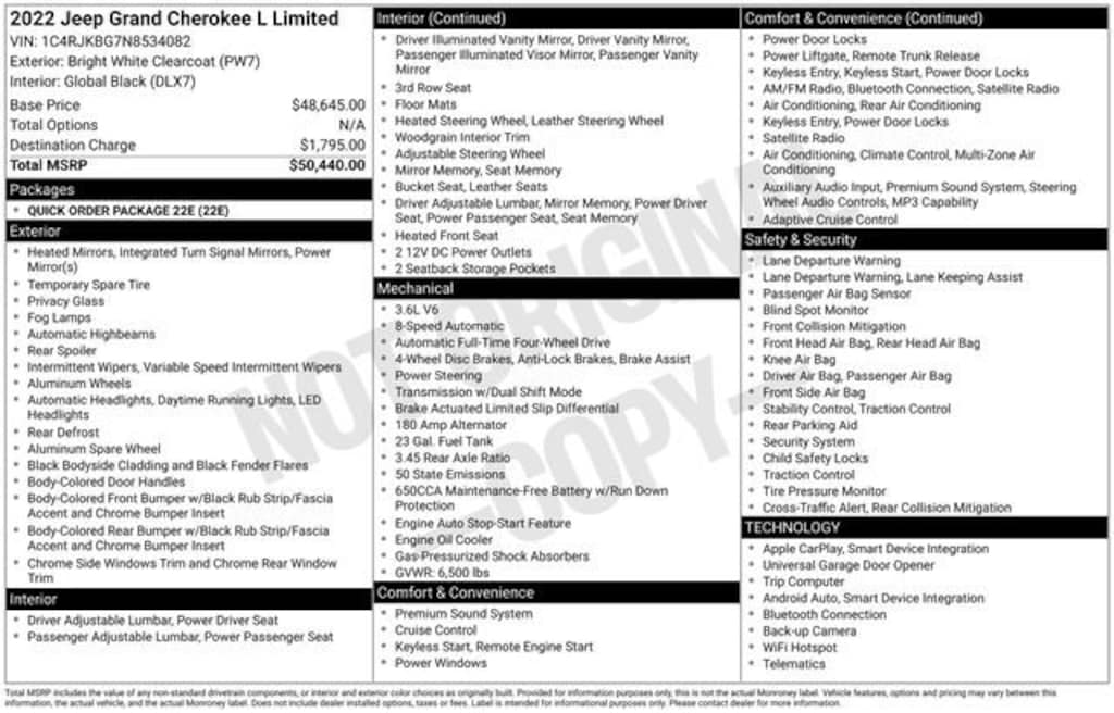 Turn every drive into something special with this Jeep Grand Cherokee L from Salt Lake Valley Chevrolet! Designed for comfort, performance, and style, this vehicle comes fully equipped with modern technology and convenience features youâll love. Plus, enjoy a $1,000 finance savings, already included in the sale price, when you finance through one of our trusted lending partners. If youâre shopping for used cars in Salt Lake City, or searching for the perfect SUV, truck, or sedan, this Jeep Grand Cherokee L delivers the dependability and value youâre looking for. Itâs the ideal match for your lifestyle - ready for everything from mountain adventures to city commutes. Visit Salt Lake Valley Chevrolet today and see why so many Utah drivers trust us for great deals on quality pre-owned vehicles. Explore our inventory online at www.slvchevy.com or call 801-969-8221 to schedule your test drive today! This impressive vehicle includes Quick Order Package 22E, 3.45 Rear Axle Ratio, 3rd row seats: split-bench, 4-Wheel Disc Brakes, 4G LTE Wi-Fi Hot Spot, 6 Speakers, ABS brakes, Active Noise Control System, Air Conditioning, Alloy wheels, AM/FM radio: SiriusXM with 360L, Anti-whiplash front head restraints, Apple CarPlay, Audio memory, Auto High-beam Headlights, Automatic temperature control, Brake assist, Bumpers: body-color, Capri Leather Seats, Compass, Connectivity - US/Canada, Delay-off headlights, Disassociated Touchscreen Display, Driver door bin, Driver vanity mirror, Dual front impact airbags, Dual front side impact airbags, Electronic Stability Control, Emergency communication system, For Details, Visit DriveUconnect.com, For More Info, Call 800-643-2112, Four wheel independent suspension, Front anti-roll bar, Front Bucket Seats, Front Center Armrest w/Storage, Front dual zone A/C, Front fog lights, Front reading lights, Fully automatic headlights, Garage door transmitter, Global Telematics Box Module (TBM), Google Android Auto, GPS Antenna Input, Heated door mirrors, Heated front seats, Heated rear seats, Heated steering wheel, Illuminated entry, Integrated Center Stack Radio, Integrated Voice Command w/Bluetooth, Knee airbag, Leather steering wheel, Low tire pressure warning, Manual Fold Seatbacks, Memory seat, Normal Duty Suspension, Occupant sensing airbag, Outside temperature display, Overhead airbag, Overhead console, Panic alarm, ParkView Rear Back-Up Camera, Passenger door bin, Passenger vanity mirror, Power door mirrors, Power driver seat, Power Liftgate, Power passenger seat, Power steering, Power windows, Radio data system, Radio: Uconnect 5 w/8.4 Display, Rear air conditioning, Rear anti-roll bar, Rear reading lights, Rear window defroster, Rear window wiper, Reclining 3rd row seat, Remote keyless entry, Security system, SiriusXM Radio Service, SiriusXM Satellite Radio, SiriusXM w/360L, Speed control, Speed-Sensitive Wipers, Split folding rear seat, Spoiler, Steering wheel mounted audio controls, Tachometer, Telescoping steering wheel, Tilt steering wheel, Traction control, Trip computer, Turn signal indicator mirrors, USB Host Flip, Variably intermittent wipers, Voltmeter, and Wheels: 18 x 8.0 Fully Painted Aluminum 2, offering everything you need for your next adventure.