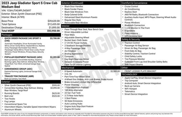 Turn every drive into something special with this Jeep Gladiator from Salt Lake Valley Chevrolet! Designed for comfort, performance, and style, this vehicle comes fully equipped with modern technology and convenience features youâll love. Price excludes tax, title, license fee, government fees, and $449 dealer documentary service fee. While every reasonable effort is made to ensure accuracy, we are not responsible for errors or omissions, and vehicles may be sold prior to inquiry please contact the dealer to confirm availability. All financing is subject to approved credit. If youâre shopping for used cars in Salt Lake City, or searching for the perfect SUV, truck, or sedan, this Jeep Gladiator delivers the dependability and value youâre looking for. Itâs the ideal match for your lifestyle - ready for everything from mountain adventures to city commutes. Visit Salt Lake Valley Chevrolet today and see why so many Utah drivers trust us for great deals on quality pre-owned vehicles. Explore our inventory online at www.slvchevy.com or call 801-969-8221 to schedule your test drive today! This impressive vehicle includes Convenience Group (Daytime Running Lamp System and Universal Garage Door Opener), Popular Equipment Package (Black 3-Piece Hard Top), Quick Order Package 24S Sport S (Automatic Headlamps, Deep Tint Sunscreen Windows, Front 1-Touch Down Power Windows, Normal Duty Plus Suspension, Power Heated Mirrors, Power Tailgate Lock, Premium Wrapped Steering Wheel, Remote Keyless Entry, Security Alarm, Speed Sensitive Power Locks, Sport S, Sun Visors w/Illuminated Vanity Mirrors, and Wheels: 17 x 7.5 Tech Silver Aluminum), Trailer Tow Package (240 Amp Alternator, Class IV Receiver Hitch, Heavy-Duty Engine Cooling, and Trailer Hitch Zoom), 3.73 Rear Axle Ratio, 4-Wheel Disc Brakes, 4G LTE Wi-Fi Hot Spot, 8 Speakers, ABS brakes, Air Conditioning, AM/FM radio, Apple CarPlay, Apple CarPlay/Android Auto, Brake assist, Cloth Low-Back Bucket Seats, Compass, Delay-off headlights, Driver door bin, Driver vanity mirror, Dual front impact airbags, Dual front side impact airbags, Electronic Stability Control, Emergency communication system, Front anti-roll bar, Front Bucket Seats, Front Center Armrest w/Storage, Front fog lights, Front License Plate Bracket, Front reading lights, Google Android Auto, GPS Antenna Input, Integrated Center Stack Radio, Integrated roll-over protection, Integrated Voice Command w/Bluetooth, Low tire pressure warning, Mopar Black Tubular Side Steps, MOPAR Spray In Bedliner, Normal Duty Suspension, Occupant sensing airbag, Outside temperature display, ParkView Rear Back-Up Camera, Passenger door bin, Passenger vanity mirror, Power steering, Radio data system, Radio: Uconnect 4 w/7 Display, Rear anti-roll bar, Rear reading lights, Speed control, Split folding rear seat, Steering wheel mounted audio controls, Tachometer, Telescoping steering wheel, Tilt steering wheel, Traction control, Trip computer, USB Host Flip, Variably intermittent wipers, and Wheels: 17 x 7.5 Black Steel Styled, offering everything you need for your next adventure.
