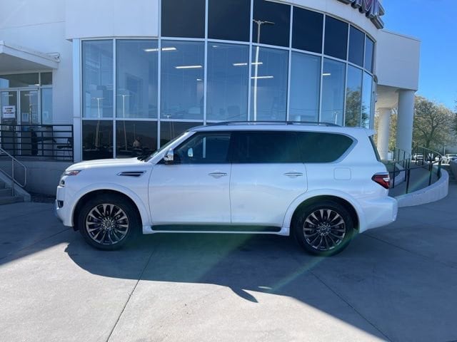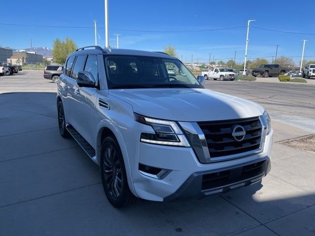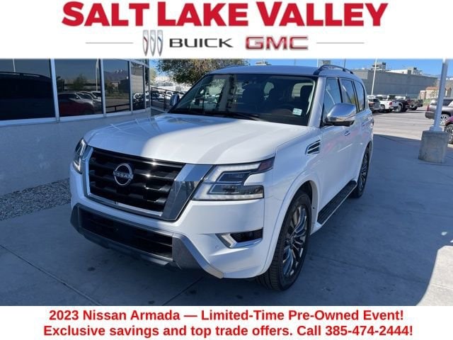 Take your drives to the next level with this Nissan Armada from Salt Lake Valley Buick GMC! Engineered for a smooth ride, advanced convenience, and lasting dependability, this vehicle is ready to handle everything your day throws at you. Price excludes tax, title, license fee, government fees, and $449 dealer documentary service fee. While every reasonable effort is made to ensure accuracy, we are not responsible for errors or omissions, and vehicles may be sold prior to inquiry please contact the dealer to confirm availability. All financing is subject to approved credit. Looking for quality used cars in Salt Lake City? This Nissan Armada delivers style, versatility, and value - perfect for daily commutes, family trips, or weekend adventures. Stop by Salt Lake Valley Buick GMC to see this vehicle in person and explore our wide selection of pre-owned cars, trucks, and SUVs. Browse online at www.slvbuickgmc.com or call 801-265-1511 to schedule your test drive today! With Captain's Chairs Package (2nd Row Captain's Chairs and 2nd Row Center Console w/Padded Armrest), Cargo Package, 13 Speakers, 2.94 Axle Ratio, 3rd Row Carpeted Floor Mats - Captain Seat, 3rd row seats: split-bench, 4-Wheel Disc Brakes, A/V remote, ABS brakes, Air Conditioning, Alloy wheels, AM/FM radio: SiriusXM, Anti-whiplash front head restraints, Auto High-beam Headlights, Auto tilt-away steering wheel, Auto-dimming door mirrors, Auto-dimming Rear-View mirror, Auto-leveling suspension, Automatic temperature control, Bose 13-Speaker Premium Audio System, Brake assist, Bumpers: body-color, Climate-Controlled Front Bucket Seats, Cross Bars, Delay-off headlights, Driver door bin, Driver vanity mirror, Dual front impact airbags, Dual front side impact airbags, Electronic Stability Control, Emergency communication system: NissanConnect Services, Exterior Parking Camera Rear, Four wheel independent suspension, Front anti-roll bar, Front Bucket Seats, Front Center Armrest, Front dual zone A/C, Front fog lights, Front reading lights, Fully automatic headlights, Garage door transmitter: HomeLink, Headphones, Heated door mirrors, Heated front seats, Heated rear seats, Heated steering wheel, Illuminated entry, Knee airbag, Leather Shift Knob, Low tire pressure warning, Memory seat, Navigation System, Nissan USB Charging Cable Set, NissanConnect featuring Apple CarPlay and Android Auto, Occupant sensing airbag, Outside temperature display, Overhead airbag, Overhead console, Panic alarm, Passenger door bin, Passenger vanity mirror, Power door mirrors, Power driver seat, Power Liftgate, Power moonroof, Power passenger seat, Power steering, Power windows, Premium audio system: Bose, Quilted Leather Seat Trim, Radio: NissanConnect w/SiriusXM, Rain sensing wipers, Rear air conditioning, Rear anti-roll bar, Rear reading lights, Rear seat center armrest, Rear window defroster, Rear window wiper, Rear-Seat Entertainment, Reclining 3rd row seat, Remote keyless entry, Security system, Speed control, Speed-sensing steering, Speed-Sensitive Wipers, Split folding rear seat, Spoiler, Steering wheel memory, Steering wheel mounted audio controls, Tachometer, Telescoping steering wheel, Tilt steering wheel, Traction control, Trip computer, Turn signal indicator mirrors, Variably intermittent wipers, Ventilated front seats, Voltmeter, and Wheels: 22 x 8J Machine-Faced w/Tinted Clear Coat designed for convenience and enjoyment, this Nissan Armada is ready to take you wherever you want to go.