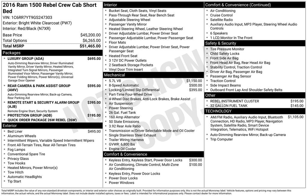 Check out our award winning dealership! 5-star google review, drive a little save a lot. Luxury Group (Auto-Dimming Exterior Mirrors, Exterior Mirrors Courtesy Lamps, Exterior Mirrors w/Supplemental Signals, Glove Box Lamp, LED Bed Lighting, Overhead Console w/Garage Door Opener, Power Folding Mirrors, Power Heated Fold-Away Mirrors, Rear Dome w/On/Off Switch Lamp, Rear-View Auto-Dimming Mirror w/Microphone, Sun Visors w/Illuminated Vanity Mirrors, Underhood Lamp, and Universal Garage Door Opener), Protection Group, Quick Order Package 26W Rebel (Dual Rear Exhaust w/Bright Tips, Flat Black 5.7L Hemi Badge, Flat Black Ram 1500 Badge, and Ram Glove Box Badge), Rear Camera & Park Assist Group (ParkSense Rear Park Assist System, ParkView Rear Back-Up Camera, and Rear View Auto Dim Mirror w/Display), Remote Start & Security Alarm Group (Security Alarm), 1 Yr. Trial (Registration Required), 3.92 Rear Axle Ratio, 32 Gallon Fuel Tank, 4-Wheel Disc Brakes, 5-Year SiriusXM Traffic Service, 5-Year SiriusXM Travel Link Service, 6 Speakers, 8.4" Touchscreen Display, ABS brakes, Air Conditioning, Air Conditioning ATC w/Dual Zone Control, Alloy wheels, AM/FM radio, Anti-Spin Differential Rear Axle, Auto-leveling suspension, Brake assist, Compass, Delay-off headlights, Driver door bin, Dual front impact airbags, Dual front side impact airbags, Electronic Shift, Electronic Stability Control, For Details Visit DriveUconnect.com, Front anti-roll bar, Front Bucket Seats, Front Center Armrest w/Storage, Front fog lights, Front reading lights, Front wheel independent suspension, Fully automatic headlights, GPS Antenna Input, GPS Navigation, HD Radio, Heated door mirrors, Heated front seats, Heated steering wheel, Illuminated entry, Integrated Voice Command w/Bluetooth, Keyless Enter-N-Go, Leather steering wheel, Low tire pressure warning, Media Hub (SD, USB, AUX), Occupant sensing airbag, Outside temperature display, Overhead airbag, Overhead console, Panic alarm, Passenger door bin, Passenger vanity mirror, Power door mirrors, Power driver seat, Power passenger seat, Power steering, Power windows, Premium Cloth Seats w/Emboss Tread Pattern, Radio data system, Radio: Uconnect 5.0, Radio: Uconnect 8.4 NAV, Rear anti-roll bar, Rear seat center armrest, Rear step bumper, Rebel Instrument Cluster, Remote keyless entry, Remote Proximity Keyless Entry, Remote SD Card Slot, SIRIUSXM Satellite Radio, SIRIUSXM Traffic, SiriusXM Travel Link, Speed control, Split folding rear seat, Spray In Bedliner, Steering wheel mounted audio controls, Tachometer, Tilt steering wheel, Tip Start, Traction control, Trip computer, Uconnect Access, Uconnect Access 1 Year Trial, Variably intermittent wipers, Voltmeter, and Wheels: 17" x 8" Aluminum w/Matte Black Pocket Sale Price Includes $1,000 Finance Savings. Contact Dealer For DetailS.