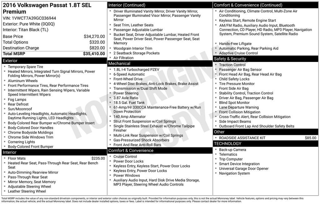 Pure White 2016 Volkswagen Passat SEL Premium FWD 6-Speed Automatic with Tiptronic 1.8L TSI Black Leather.Recent Arrival! 25/38 City/Highway MPGAwards:* 2016 KBB.com 10 Most Comfortable Cars Under $30,000Check out our 5 Star Google Reviews! Drive a little save a lot. Sale Price Includes $1,000 Finance Savings. Contact Dealer For Details.