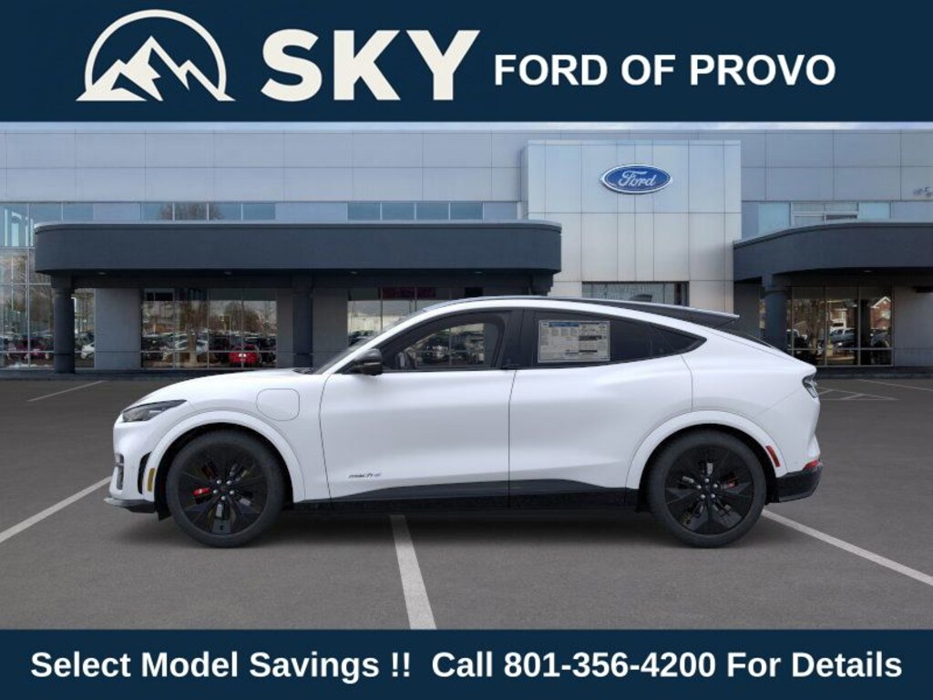 This 2025 Star White Metallic Tri-Coat Ford Mustang Mach-E GT AWD is well equipped and includes these features and benefits: 10 Speakers, 4-Wheel Disc Brakes, ABS brakes, Adaptive suspension, Air Conditioning, Alloy wheels, AM/FM radio: SiriusXM with 360L, Apple CarPlay/Android Auto, Auto High-beam Headlights, Auto-dimming Rear-View mirror, Automatic temperature control, Brake assist, Bumpers: body-color, Compass, Delay-off headlights, Driver door bin, Driver vanity mirror, Dual front impact airbags, Dual front side impact airbags, Electronic Stability Control, Emergency communication system: 911 Assist, Exterior Parking Camera Rear, Four wheel independent suspension, Front anti-roll bar, Front Bucket Seats, Front Center Armrest, Front dual zone A/C, Front reading lights, Fully automatic headlights, Garage door transmitter, Heated door mirrors, Heated front seats, Heated Perforated ActiveX Performance Seats, Heated steering wheel, Illuminated entry, Knee airbag, Low tire pressure warning, Memory seat, Navigation system: Connected Navigation, Occupant sensing airbag, Outside temperature display, Overhead airbag, Overhead console, Panic alarm, Passenger door bin, Passenger vanity mirror, Power door mirrors, Power driver seat, Power Liftgate, Power passenger seat, Power steering, Power windows, Radio data system, Radio: B&O Sound System by Bang & Olufsen, Rain sensing wipers, Rear anti-roll bar, Rear seat center armrest, Rear side impact airbag, Rear window defroster, Rear window wiper, Remote keyless entry, Security system, SiriusXM w/360L, Speed control, Speed-sensing steering, Speed-Sensitive Wipers, Split folding rear seat, Spoiler, Steering wheel mounted audio controls, SYNC 4A w/Enhanced Voice Recognition, Telescoping steering wheel, Tilt steering wheel, Traction control, Trip computer, Turn signal indicator mirrors, Variably intermittent wipers, and Wheels: 20" Monochromatic High Gloss Black-Painted.